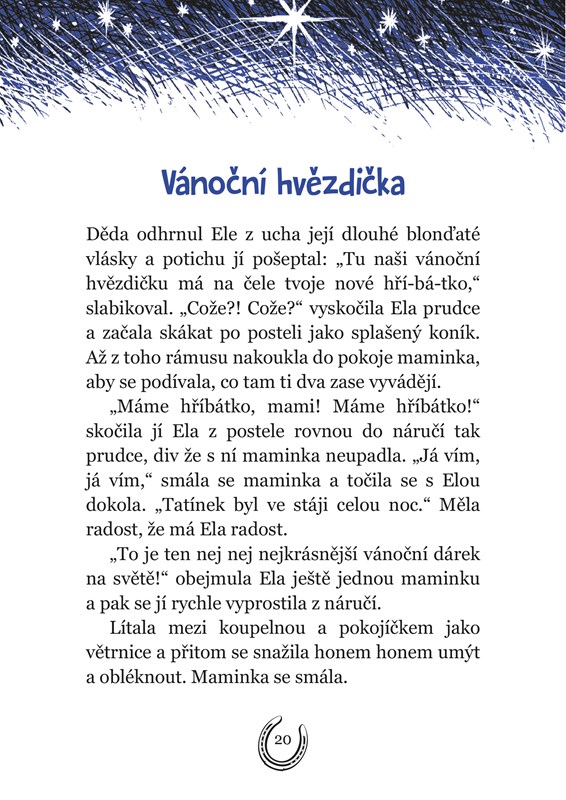Ela miluje koně nade všechno. Hodně o nich ví, a kdyby mohla, byla by ve stájích od rána do večera. Jenže tohle holky z její třídy vůbec nechápou. Ela jim připadá nudná a obyčejná. To už se ale brzy změní. Stačí, aby se o Vánocích narodilo malé hříbátko s hvězdičkou na čele, a rázem se Ele i holkám obrátí život vzhůru nohama. Holky objeví kouzlo koňského světa a lépe poznají i Elu samotnou. Jezdecký oddíl Hvězdičky pak jejich přátelství jenom utvrdí.