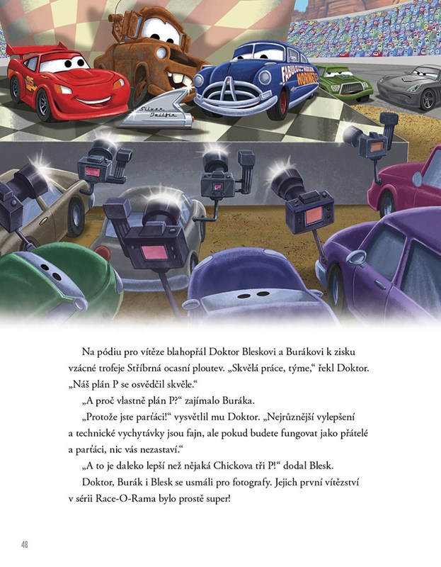 Vydejte se v deseti příbězích na závodnickou dráhu! Společnost vám budou dělat Blesk McQueen s Burákem a jejich staří i noví přátelé. Podíváte se nejen do Kardanové Lhoty, ale prosvištíte spoustu míst po celém světě - od Německa, Itálie a Ruska až po Japonsko! Každou pohádku přečtete nahlas za pouhých pět minut, což je ideální délka čtení před spaním... nebo prostě jen tak pro radost!