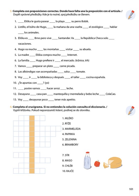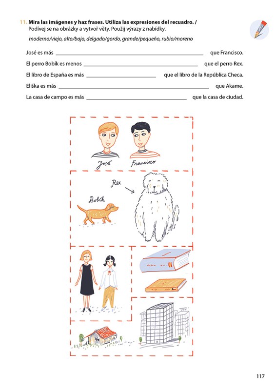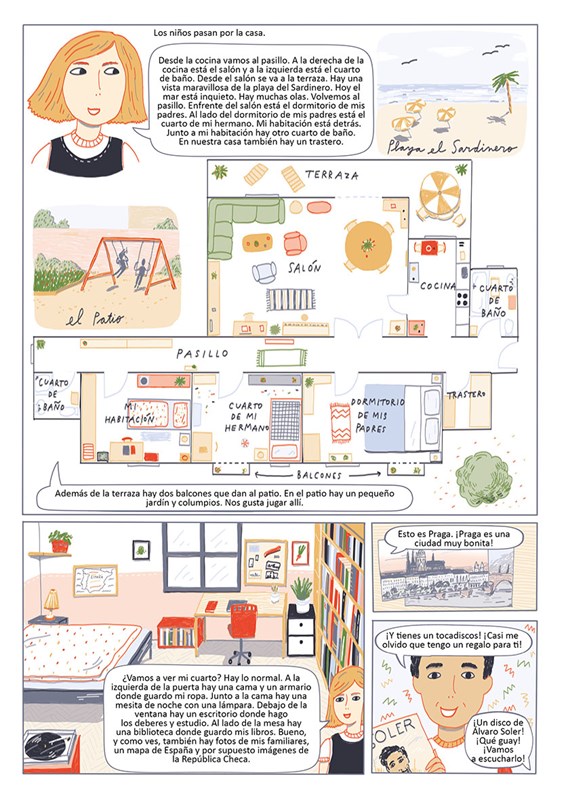 Úvodem každé kapitoly je komiks s hlavními postavami knihy. Díky komiksovému zpracování se děti seznámí s novou slovní zásobou a gramatikou. Představují se v něm také některé španělské reálie, o kterých je již v českém prostředí povědomí. Po komiksu následuje slovníček, stručné vysvětlení gramatiky a cvičení.