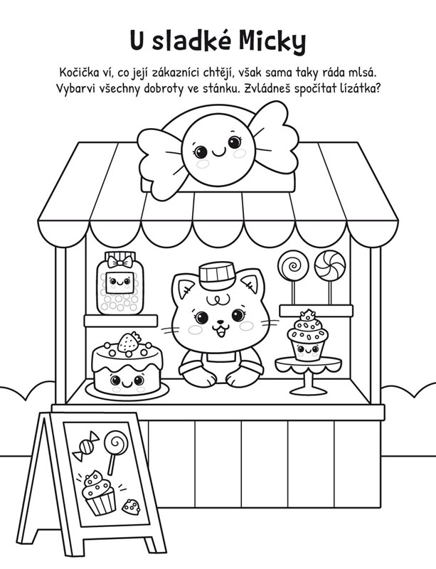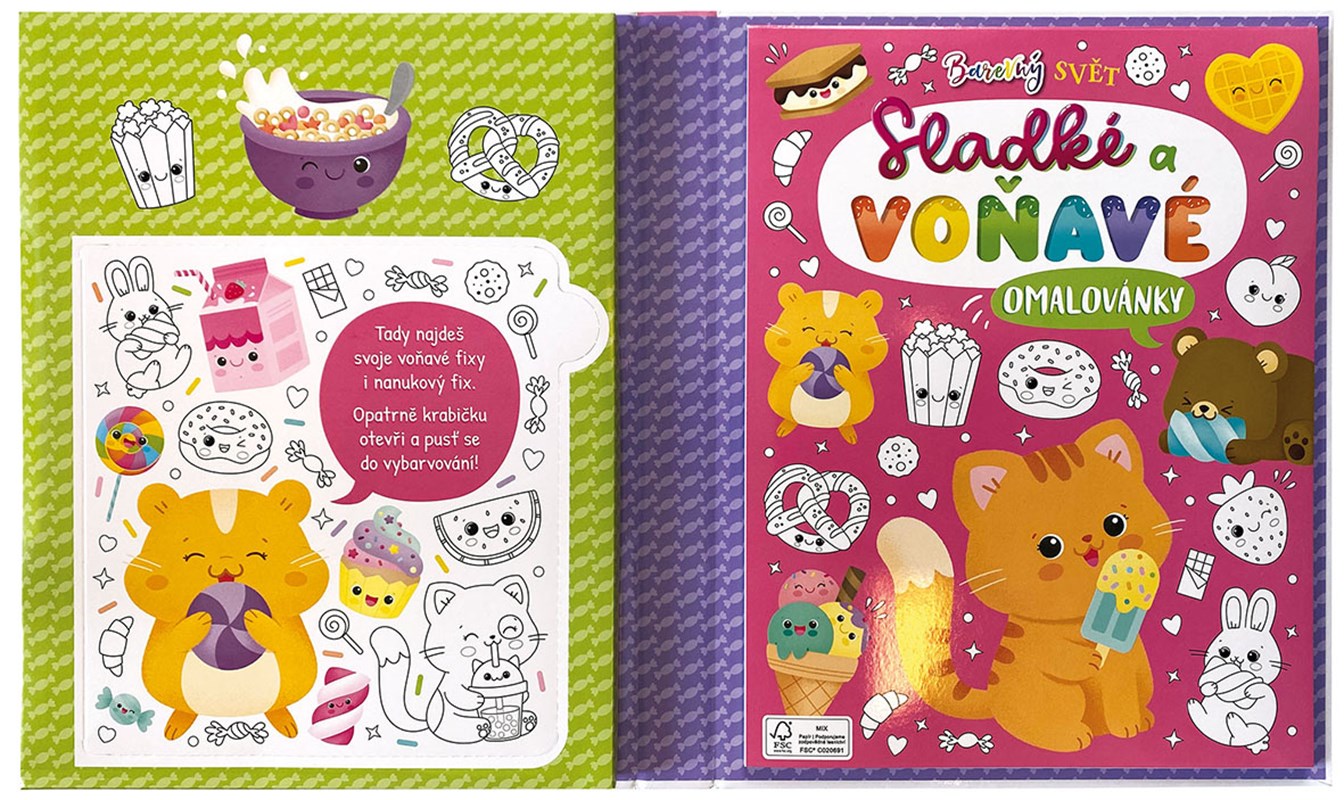 Knížka v pevných deskách, v nichž jsou uloženy 4 voňavé fixy plus 1 tvarovaný a blok s 32 černobílými omalovánkovými listy, představí malým čtenářům nejrůznější laskominy, zvířátka i pohádkové tvory. Pomůže u dětí procvičit nejen jemnou motoriku při vybarvování, ale také znalost barev, postřeh a základní počty při plnění úkolů, které obsahují stručné texty v obrázcích.