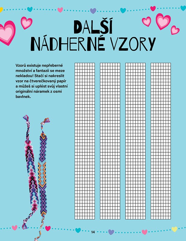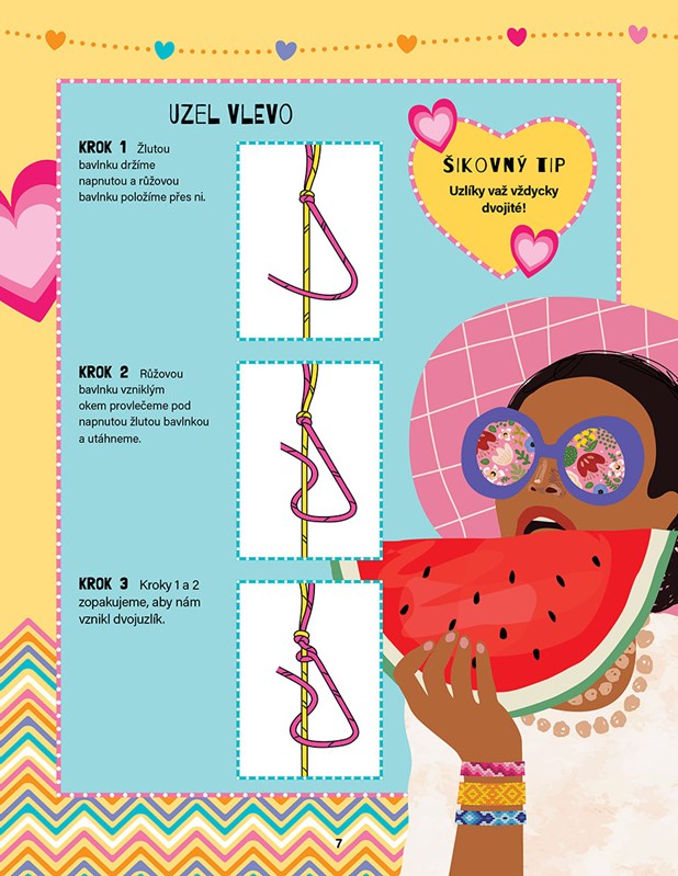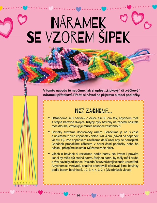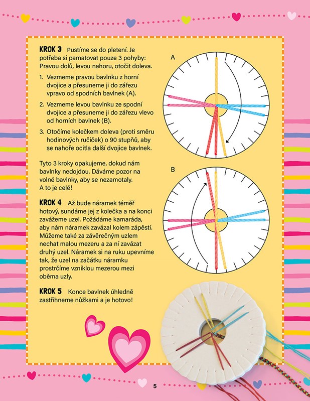 Tento praktický sešitek obsahuje 6 barevných bavlnek, 2 pletací kolečka, 2 pletací podložky a spoustu jednoduchých nápadů na krásné vzory!