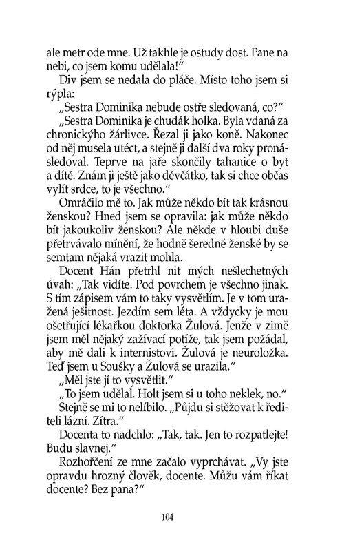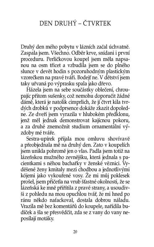 Rozvod se ženskou většinou pořádně zamává. Hrdinku této knihy ovšem zasáhl natolik, že se z jeho důsledků musí zotavovat v lázních. Potkává tam spoustu nových lidí a nemine den, aby se jí nepřihodilo něco mimořádného. A protože ony veselé příhody i trapasy popisuje Ivanka Devátá, která si získala širokou čtenářskou oblibu svým úsměvným pohledem na svět, můžete si být jisti, že se nebudete nudit ani chvíli.