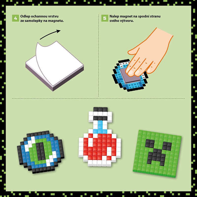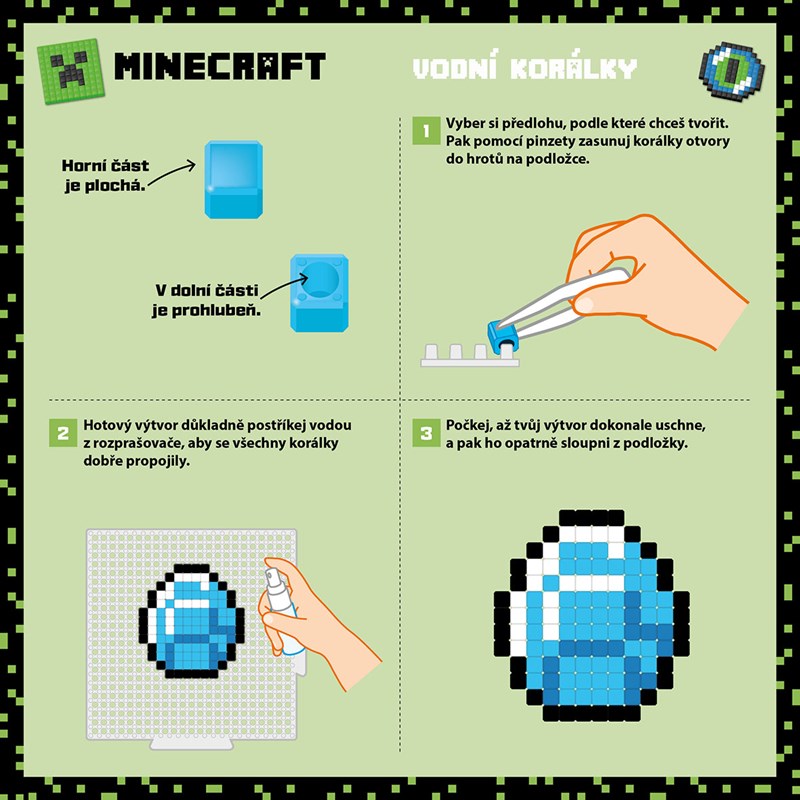Milujete Minecraft a tvoření z 3D pixelů? Vyzkoušejte báječnou techniku sestavování z vodních korálků a vytvořte si 6 úžasných minecrafťáckých výtvorů. Hotový výrobek se nezažehluje, ale stačí ho jen postříkat obyčejnou vodou, díky které se korálky vzájemně propojí. Box obsahuje vše potřebné k tvoření (návod, 600 korálků v šesti barevných odstínech, 1 pinzetu, 1 lahvičku na vodu, 1 sestavovací podložku, 5 samolepicích magnetek). Tak si pojďme společně zakraftit!