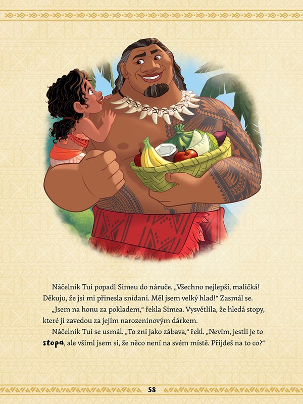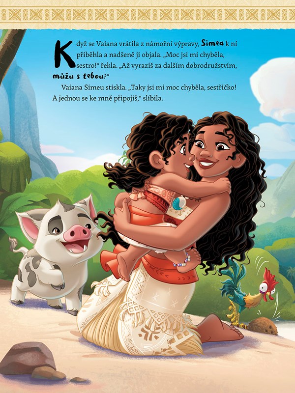 V prvním si přečtete, jak se malá Simea moc a moc chce vydat na moře. Ale velká sestra ji naučí, že na takový krok se musí velmi dobře připravit. Ve druhém vypráví Moni o svých zážitcích s Mauim. Co na tom, že se ve skutečnosti zatím nepotkali? Třetí příběh je o tom, jak Simea slavila narozeniny a Vaiana pro ni připravila honbu za pokladem – tedy narozeninovým dárkem. A nakonec se dozvíte, proč Kakamorové oslavují a zbožňují popleteného kouhouta Heiheie.