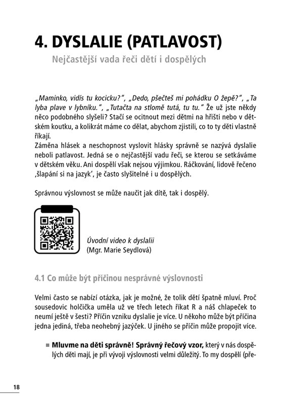 Kniha je propojena s QR kódy odkazujícími na videa na YouTube, na kterých jsou ukázky z logopedické terapie dyslalie, opožděného vývoje řeči, vývojové dysfázie a koktavosti. Na úvodních videích jsou tyto vady řeči také krátce popsány a vysvětleny.