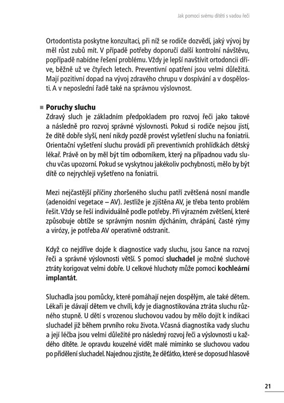 Čtenáři se seznámí s vadami řeči, které se v dětském věku vyskytují nejčastěji. Pro stanovení správné diagnózy je důležité vědět, jak se která vada řeči projevuje. V publikaci jsou proto popsány projevy jednotlivých vad řeči, najdete tu ale i praktické rady týkající se náprav, dozvíte se, kdy a kde vyhledat správného odborníka, který při diagnostice a terapii řečových vad pomůže.