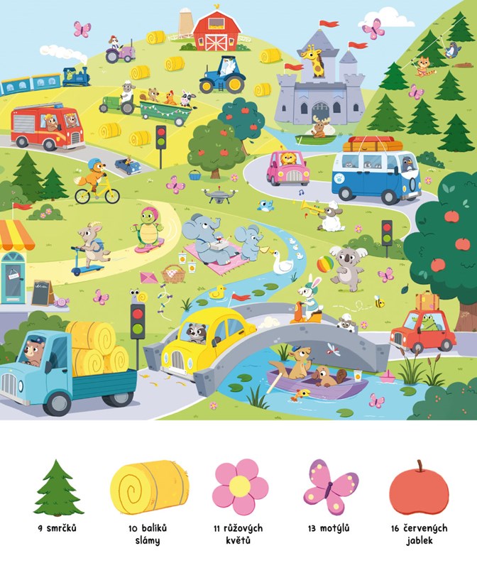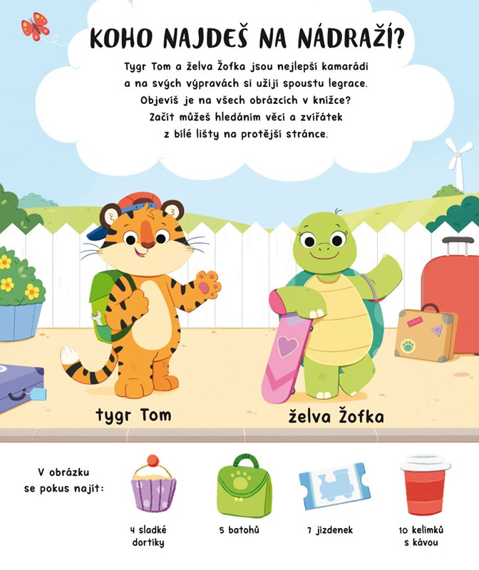 Tygr Tom a želva Žofka se rozhodli prozkoumat hektický svět dopravních prostředků. Co všechno v něm objeví? Malí čtenáři se s nimi podívají na nádraží, na letiště i na mořské pobřeží, zjistí, na čem všem se dá jezdit na zasněženém svahu nebo létat v povětří a vypraví se dokonce i do vesmíru. Tipy k hledání věcí i zvířátek na každé dvojstraně pomohou dětem procvičit postřeh a počty od 1 do 20, ale kromě toho na ně čeká ještě poslední stránka s prémiovými úkoly, která prověří paměť a zaručí, že knížka Vozidla nebude jen na jedno přečtení.
