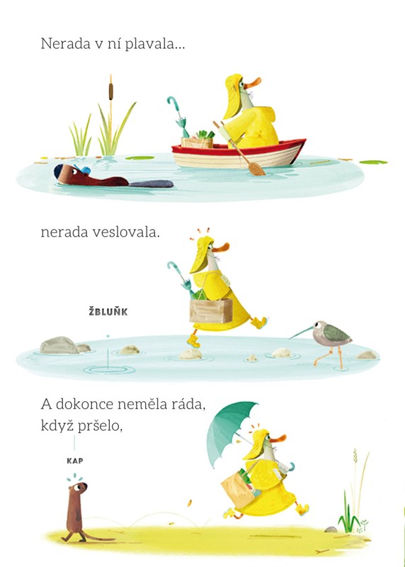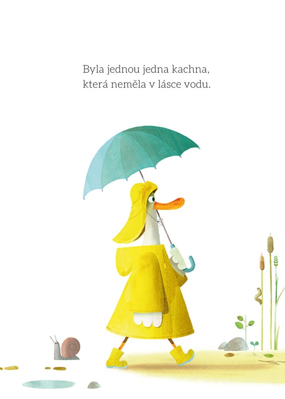 Byla jednou jedna kachna, která nebyla jako ostatní… Neměla ráda vodu. Jenže pak ji osud svedl dohromady s žabkou, která vodu naopak milovala. Jak se s tím kachna vypořádá? Dozvíte se to v téhle dojemné, nádherně ilustrované knížce o hledání přátelství i za cenu překonání vlastních strachů.