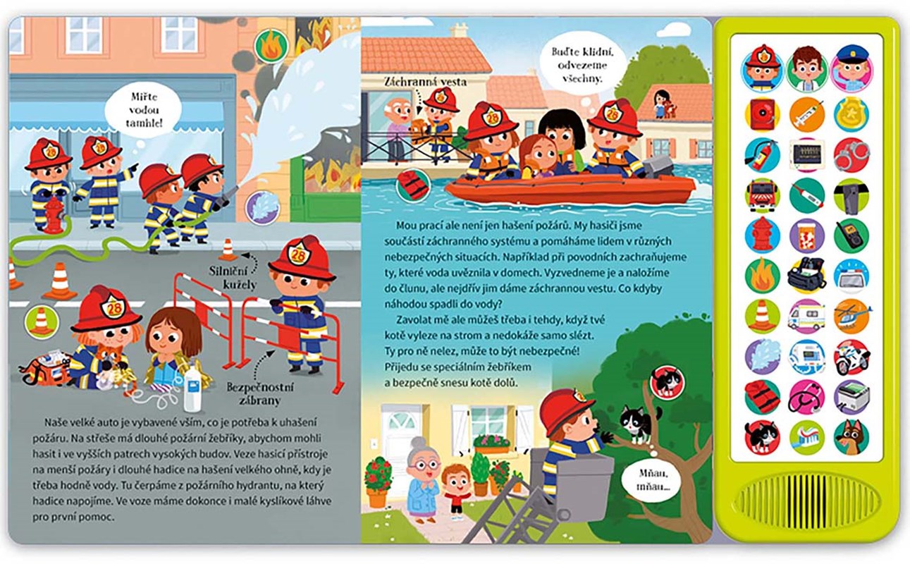 3 příběhy se zvuky – Hasiči; Doktoři; Policisté. Hasiči, lékaři a policisté vyrážejí do akce! Sleduj je při jejich náročné práci, která vyžaduje značnou odvahu, vytrvalost a často i skutečné hrdinství. Naši hrdinové ti budou vyprávět o svém běžném dni, mnohdy plném nebezpečných situací. Na konci každého příběhu najdeš rady, jak takovým situacím předcházet. Příběhy tě bude provázet 30 názorných zvuků, které se při práci odvážných hrdinů často ozývají. Stačí stisknout knoflík a poslouchat!