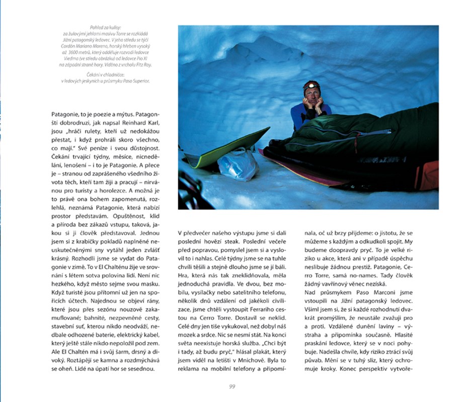 Divoká, nespoutaná a nadpozemsky krásná, země kde bydlí vítr – to je nejvýstižnější charakteristika rozlehlé Patagonie a Ohňové země. Setkání s patagonským horským světem je nezapomenutelným zážitkem. Kdo ho navštíví, odchází vášnivě zamilován. Něco z tohoto pohádkového světa nám chce autor přiblížit v této knize. Velkolepými snímky vykresluje obraz krajiny neznámých, nepokořených vrcholů. Diváka uvádí v úžas nejen záběry výjimečných míst, ale i mistrným ztvárněním zdánlivě mnohem skromnějších motivů. Dílo doplňuje jak odbornými a empatickými poznámkami o zemi a lidech, tak ověřenými informacemi pro milovníky přírody a treků, vysokohorské turisty a horolezce. Tato kniha zíslaka 3. místo na cestovatelském festivalu GO Kamera v kategorii Nejkrásnější kniha o cestování za rok 2015.