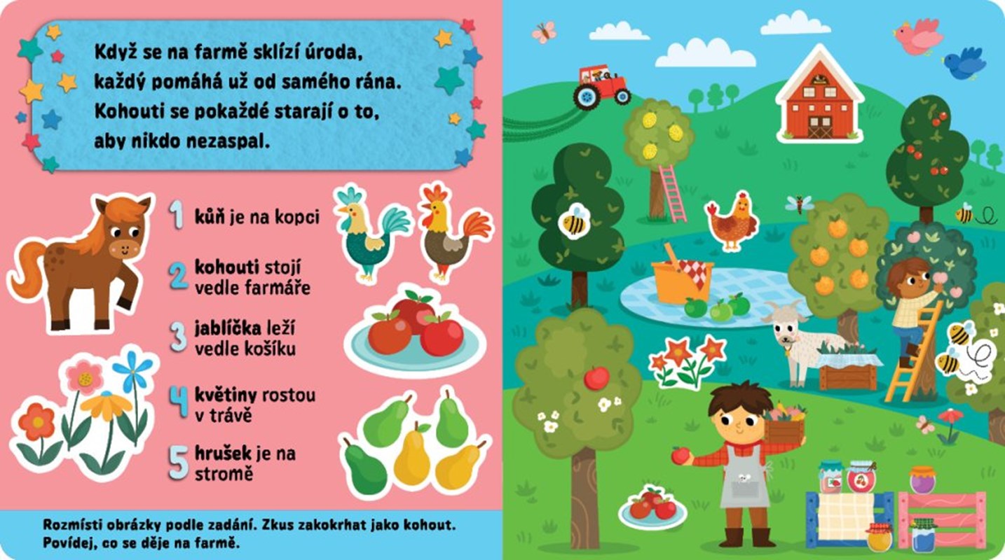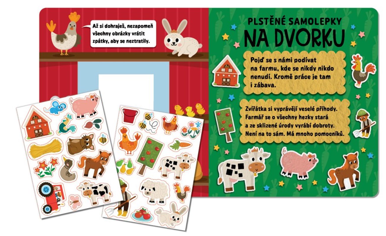 28 figurek z plsti. Stačí ti šikovné prstíky, tato knížka a zábava může začít. Pojď se podívat na dvorek, kde si zvířátka vyprávějí veselé příběhy a farmář se o všechny hezky stará. Díky měkkým plstěným samolepkám, které lze snadno přemisťovat a opakovaně používat, si můžeš dotvářet scény se slepičkami, prasátky, ovečkami a dalšími kamarády ze dvorku. Vytvoříš si tak spoustu vlastních příběhů nejen podle zadání, ale také podle vlastní fantazie. Knížka, která rozvíjí tvořivost, slovní zásobu a jemnou motoriku je ideální pro děti od 3 let.