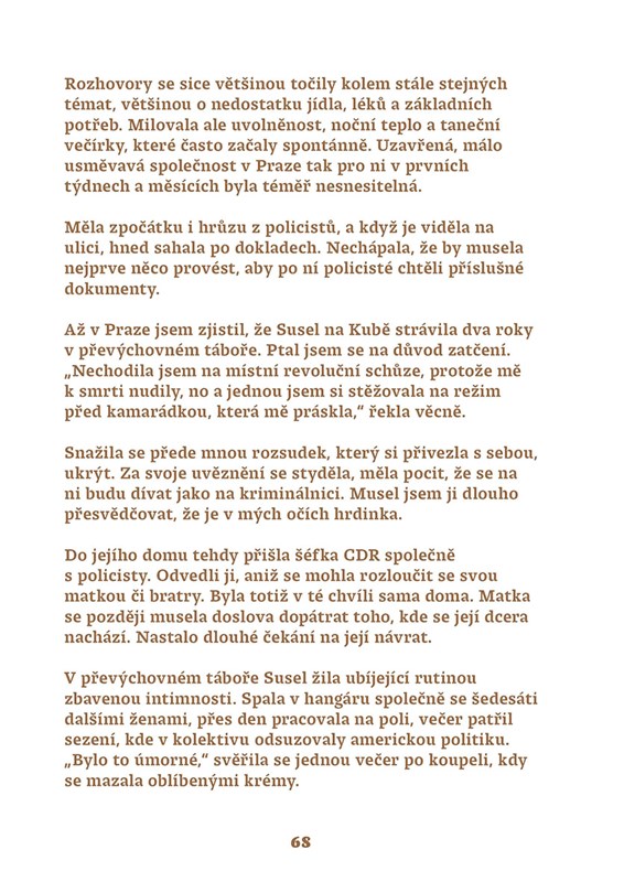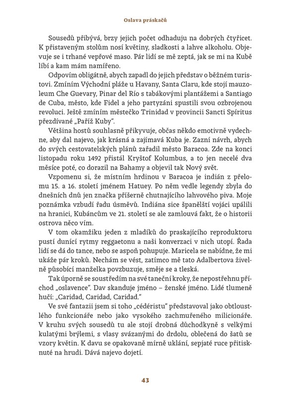 Kniha ukazuje Kubánce takové, jací skutečně jsou, s nejniternějšími tužbami, strachy, nadějemi i bolestmi, a zároveň nám v měřítku celých dekád ukazuje Kubu nejen jako peklo diktatury, kde panuje podlé zlo, ale také jako barevnou, vášnivou, srdečnou zemi plnou úžasných lidí a příběhů.