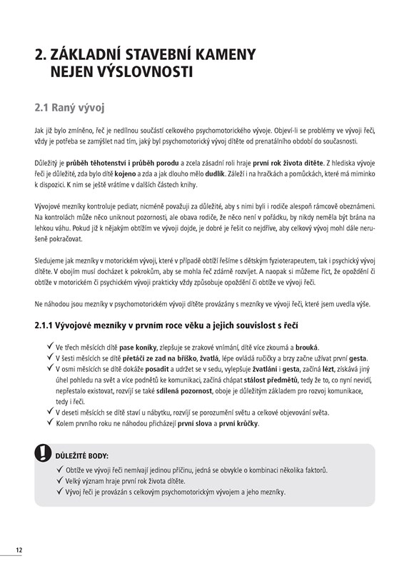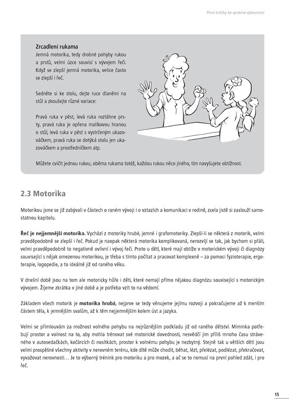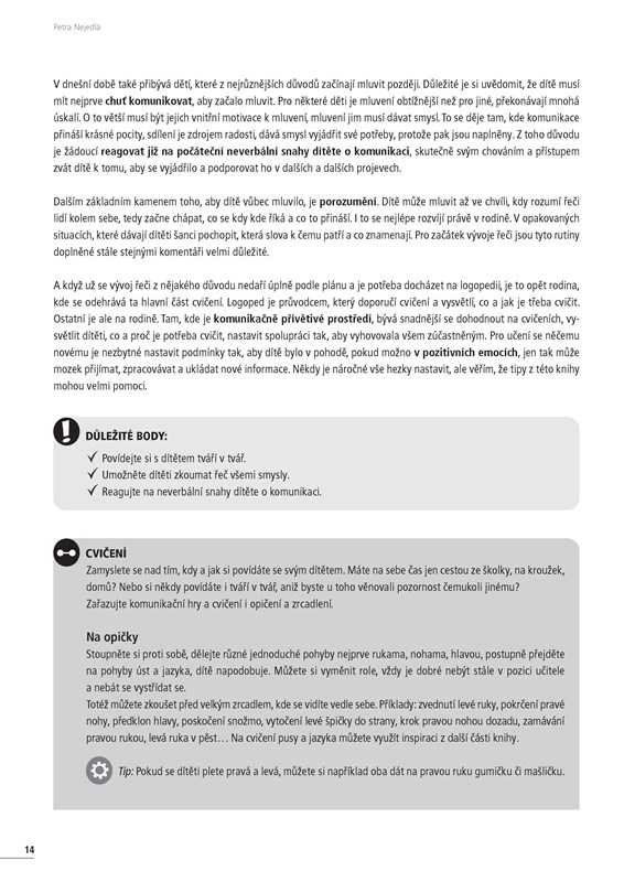Kniha ukazuje rodičům předškolních dětí, že vývoj řeči souvisí s celkovým psychomotorickým vývojem. Shrnuje základní mezníky ve vývoji řeči, základní stavební kameny nejen výslovnosti a specifika podpory vývoje řeči v jednotlivých obdobích. Nezapomíná ani na samotnou podporu pro rodiče. Za každou kapitolou následují náměty na praktická cvičení, která lze snadno zařadit do každodenní práce s dětmi.