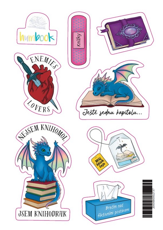 Nejsem knihomol, jsem knihodrak! Brečím nad fiktivními postavami. Ještě jednu kapitolu. Tyhle samolepky s trefnými knižními hláškami v tom mají jasno a ozdobí i tvoje sešity, diáře, notebook a vůbec všechno, co tě napadne. Arch o rozměru A5 obsahuje sedm samolepek s knižními citáty a božími ilustracemi od Michaely Dopitové i jednu s logem Humbooku.