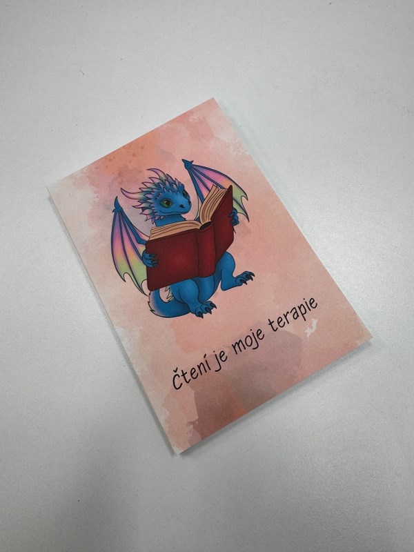 Čtení je moje terapie! Zapisuj, čmárej, kresli, lep, plánuj… na celkem 148 linkovaných stránkách o velikosti A6 k tomu budeš mít spoustu prostoru. Tenhle blok s boží ilustrací knihodráčka od Michaely Dopitové se stane tvým nepostradatelným společníkem – to si piš!
