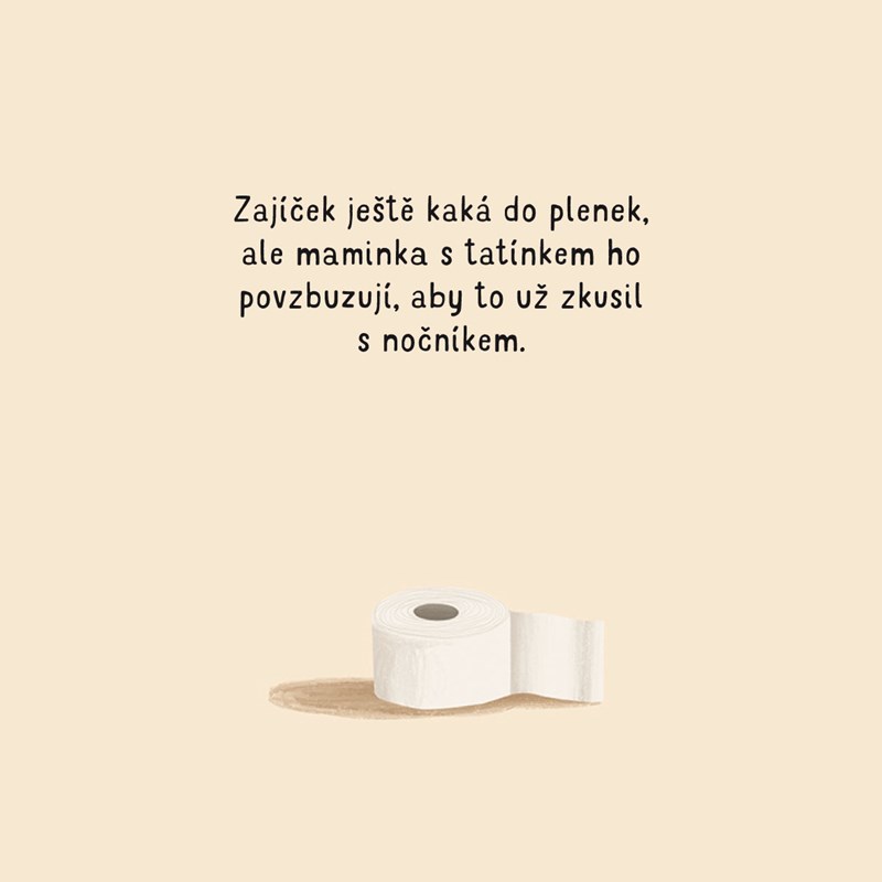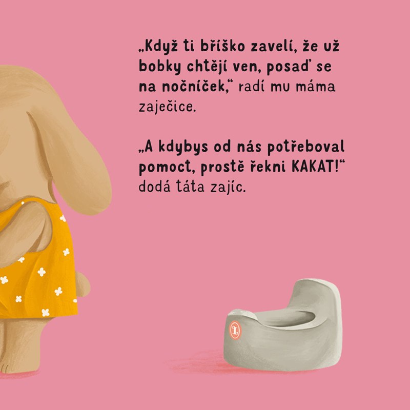 Nezbedný zajíček stojí před nelehkým úkolem: potřebuje se naučit dělat bobky do nočníku. Jak si s tím poradí? Žádný strach, táta zajíc a máma zaječice mu všechno tak šikovně vysvětlí a ukážou, že to zajíček nejen hravě zvládne, ale ještě ho chození na nočník náramně baví.