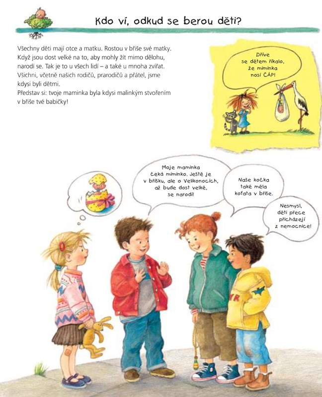 Citlivý a srozumitelný průvodce vznikem života, který přibližuje, jak dochází ke zplození dítěte, jak roste miminko v bříšku a jak probíhá porod. Kniha odpovídá na otázky, na něž malí čtenáři narážejí už v útlém věku, a nabízí jim jasné, ale citlivé odpovědi. Díky tomu je skvělým pomocníkem pro rodiče i pedagogy.