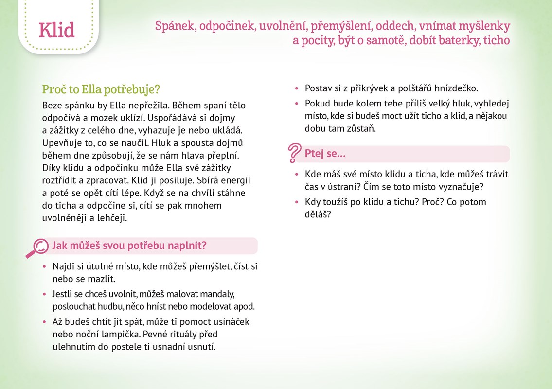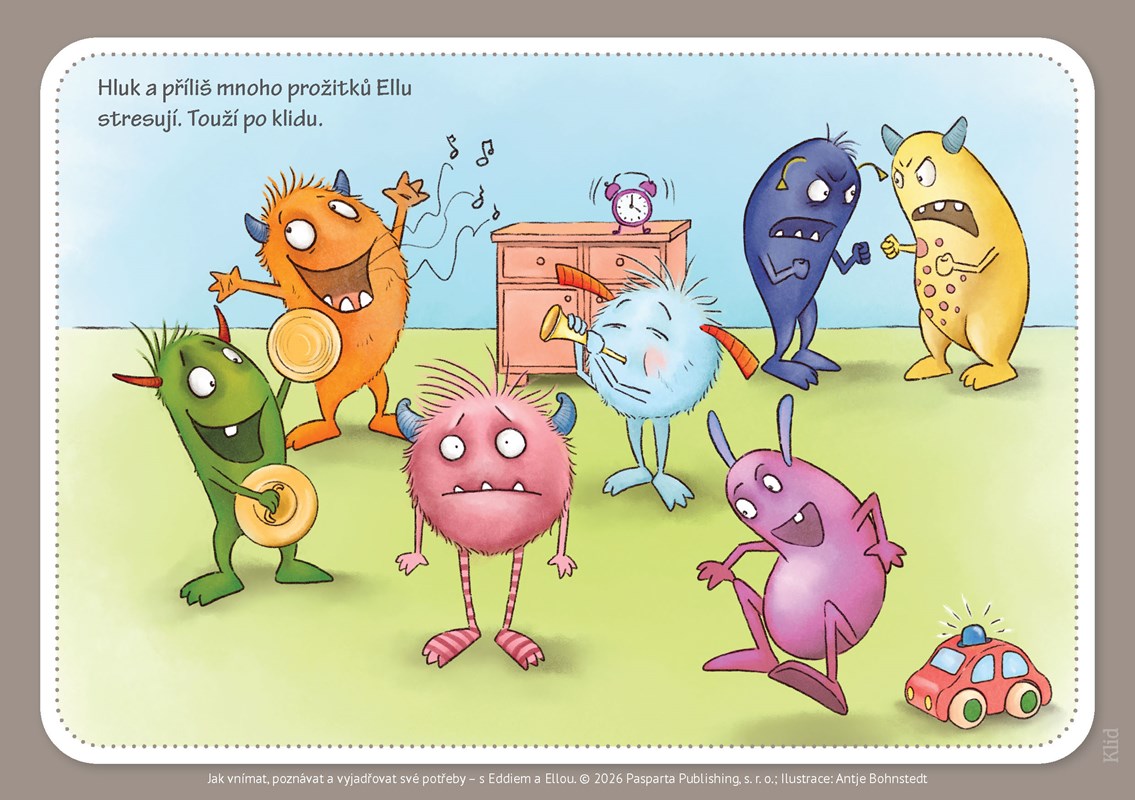 Tato sada karet s vtipnými ilustracemi umožní rodičům, ale především učitelkám a učitelům v mateřských školách a na prvním stupni ZŠ si o potřebách a emocích s dětmi popovídat. Obrázky zachycují situace, které jsou dětem důvěrně známé, a popisují 14 různých potřeb a základních pocitů. Celkem sada obsahuje 28 obrázkových karet a dvě karty s úvodními metodickými pokyny.