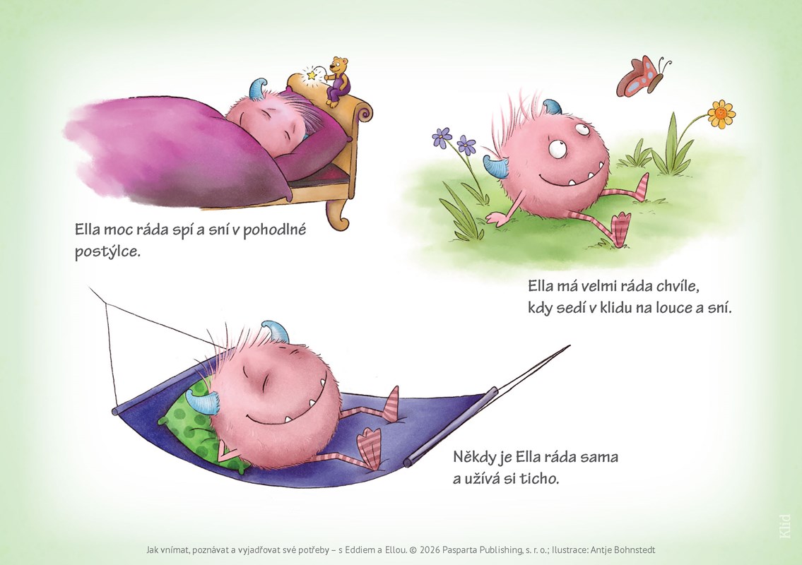Ella, mladší sestra příšerky Eddieho, který je odborníkem na pocity, seznámí děti blíže s tématem potřeb a jejich naplňování. Podobně jako Ella znají děti situace, ve kterých jsou hladové nebo potřebují obejmout. Někdy je ale pro děti těžké si danou potřebu či základní pocit s ní spojený uvědomit, natož pak o svých potřebách i o potřebách druhých mluvit či si říct o jejich naplnění.