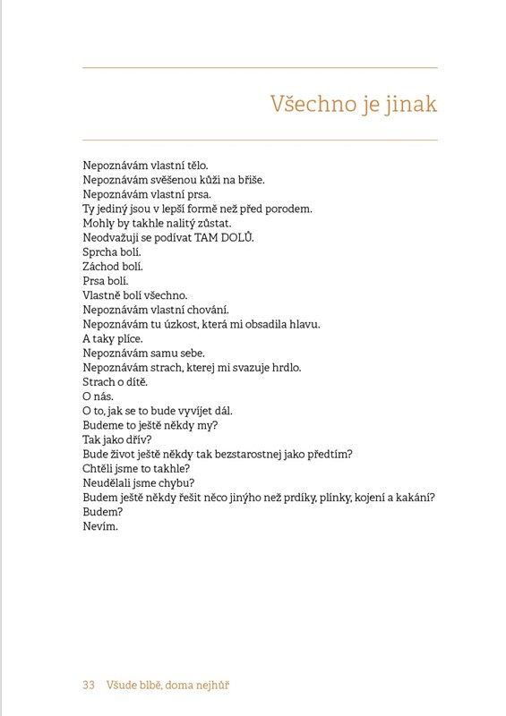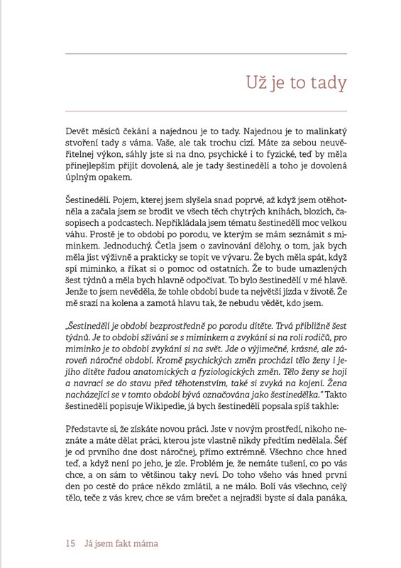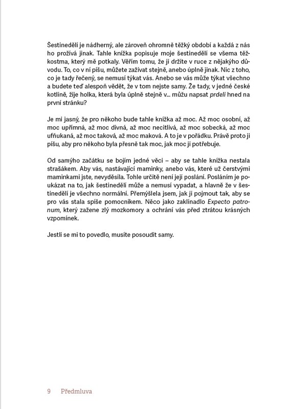 Otevřená a upřímná kniha o prvních týdnech po porodu. Autorka sdílí své vlastní radosti, strachy i těžkosti, které ženy po narození dítěte často prožívají samy v tajnosti. S odborným komentářem psychologa nabízí podporu, pochopení a praktické rady pro každou maminku, která chce projít šestinedělím s větší jistotou a klidem.