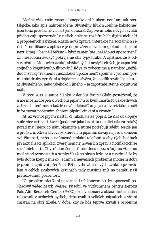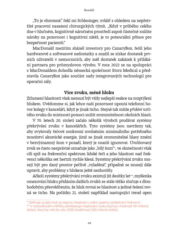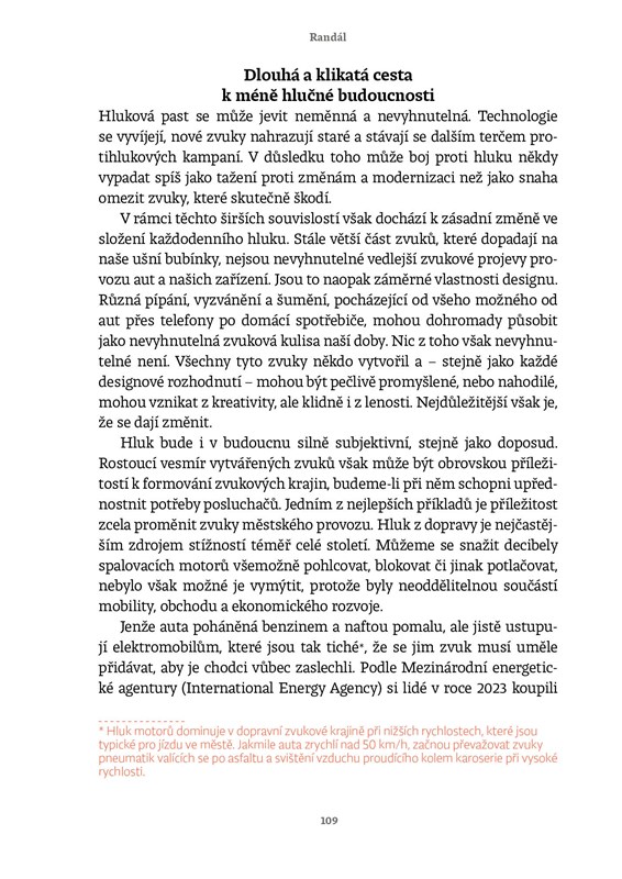 Máte pocit, že si váš mozek nikdy neodpočine? Neustálé pípání, hučení, hovory i vzdálený ruch města se staly kulisou našeho života – a zároveň nenápadným zdrojem stresu a únavy. Hluk jsme si zvykli brát jako drobnou nepříjemnost, přesto má zásadní dopad na naši psychiku, soustředění i zdraví. V knize Randál vysvětluje vědecký novinář Chris Berdik, proč nás některé zvuky dohánějí k šílenství, zatímco jiné téměř nevnímáme, kde leží hranice mezi běžným zvukem a škodlivým hlukem a co se s námi děje, když ji dlouhodobě překračujeme. Opírá se o nejnovější výzkumy a přináší překvapivé souvislosti mezi hlukem a zdravím. Tato kniha vám otevře uši i mysl. Ukáže, že řešením není jen méně decibelů, ale chytřejší přístup k tomu, jak má náš svět znít. Po jejím přečtení už hluk nebudete jen snášet – začnete mu rozumět. A možná poprvé ucítíte, že klid nemusí být luxus, ale vědomá volba.