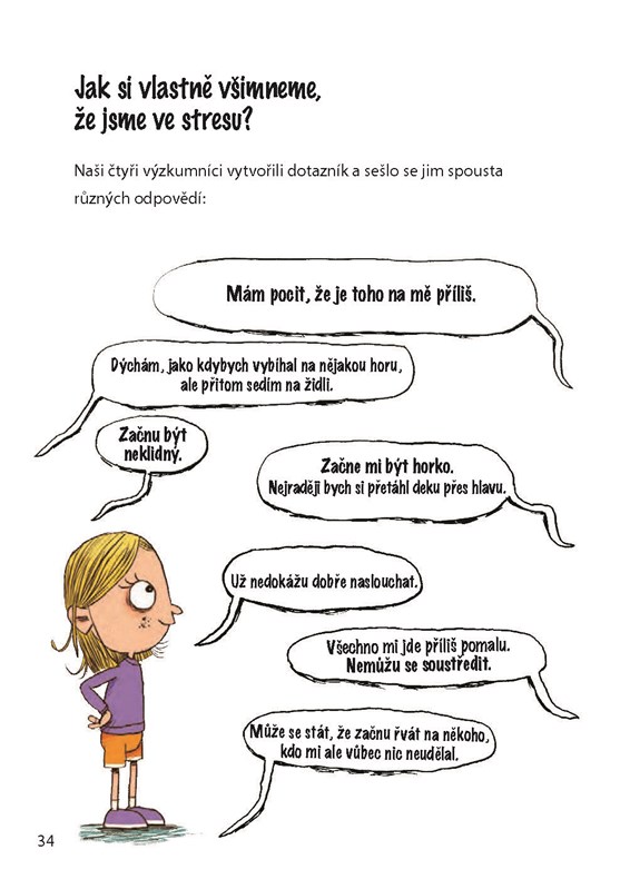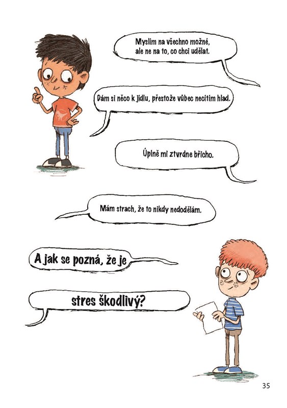 Kuba, Hanka a Jenda najdou odpovědi na tyto otázky a na stres si ze všech stran posvítí. Publikace vysvětluje, že se stres může projevovat různými způsoby. Ukazuje jednoduché triky, jak škodlivému stresu v běžném životě předcházet. Bohatě ilustrovaná kniha s napínavým příběhem může sloužit jako odrazový můstek rozhovoru mezi dospělými a dětmi na toto téma. Zároveň publikace může fungovat jako materiál k prvnímu samostatnému čtení v počátečních třídách základní školy.