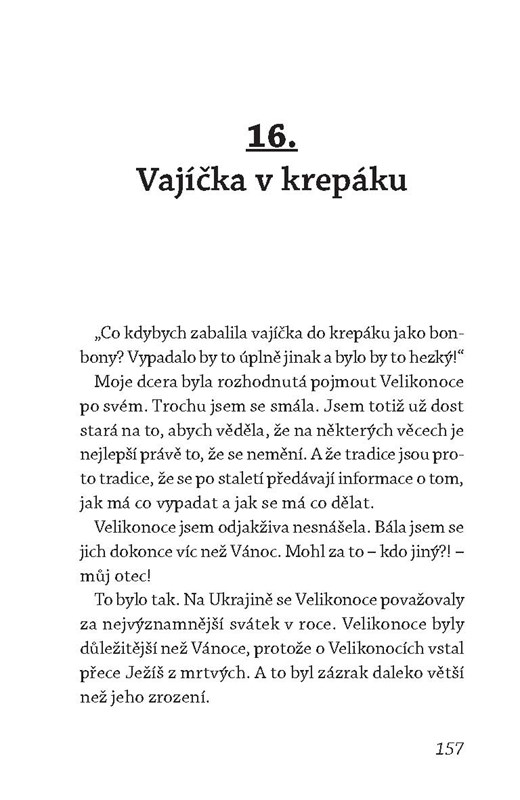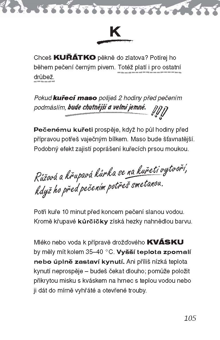 A tak vznikla tahle knížka! Jsou v ní totiž odpovědi na otázky mé dcery a jsou v ní konkrétní recepty i rady, jejichž pravdivost je ověřená zkušenostmi. A jestli náhodou i vy potřebujete vědět, jak rychle a bezbolestně zkrásnět a co předložit bestii, která koketuje s vaším mužem, tak se nechte inspirovat!