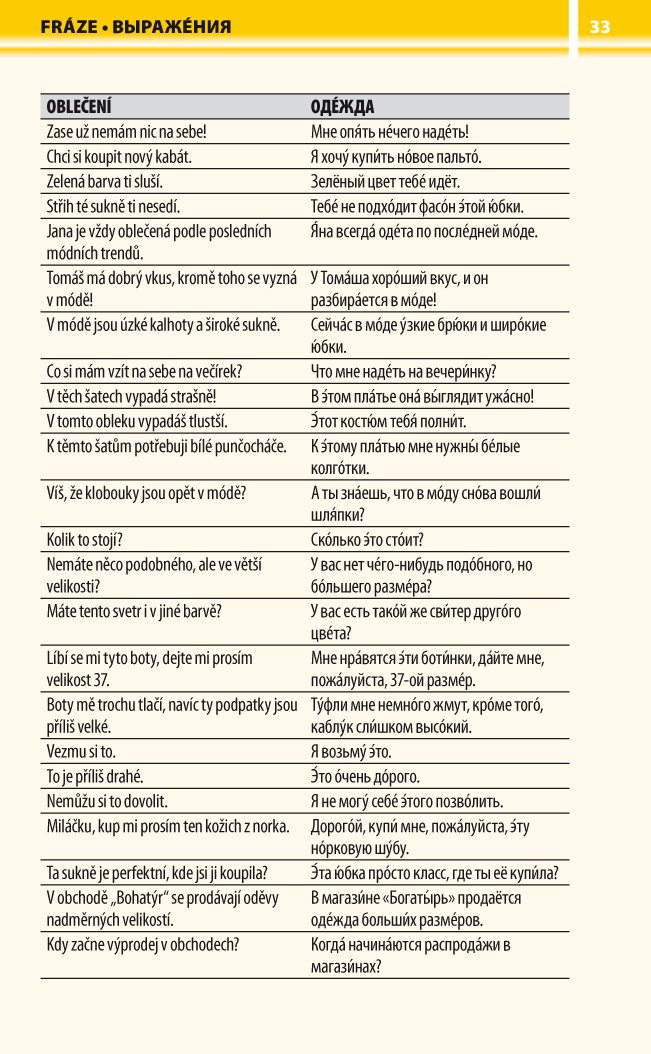 Každý tematický celek je doplněn typickými frázemi. Na konci knihy se nachází souhrnný slovníček.