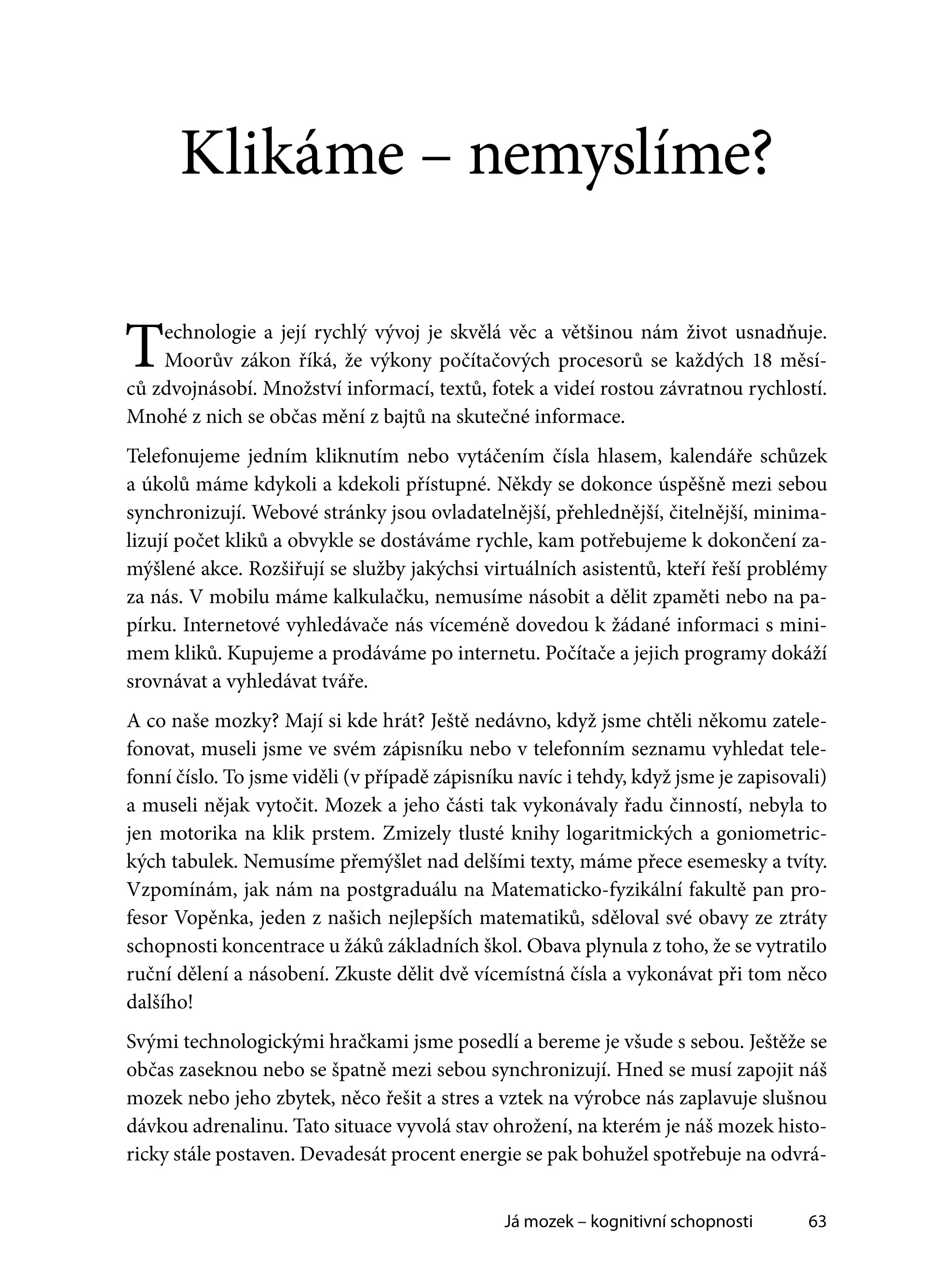 Ing. Ivan Pilný je znám z manažerské a podnikatelské sféry. Jeho předchozí knihy vycházely z vlastní praxe a zkušeností. V této knize se pouští do problematiky, která jej už několik let přitahuje – mozek, jeho trénink a efektivnější využívání. Mozek je podle jeho názoru největším a nejhůře využívaným nástrojem pokroku jak individuálního, tak společenského. Každý z nás jej může využívat ke svému prospěchu lépe. Není třeba čekat na stáří, když už budeme nejen chtít, ale muset. Kniha je pokusem stručně zachytit současný stav poznání o naší tak důležité „šedé kůře mozkové“.