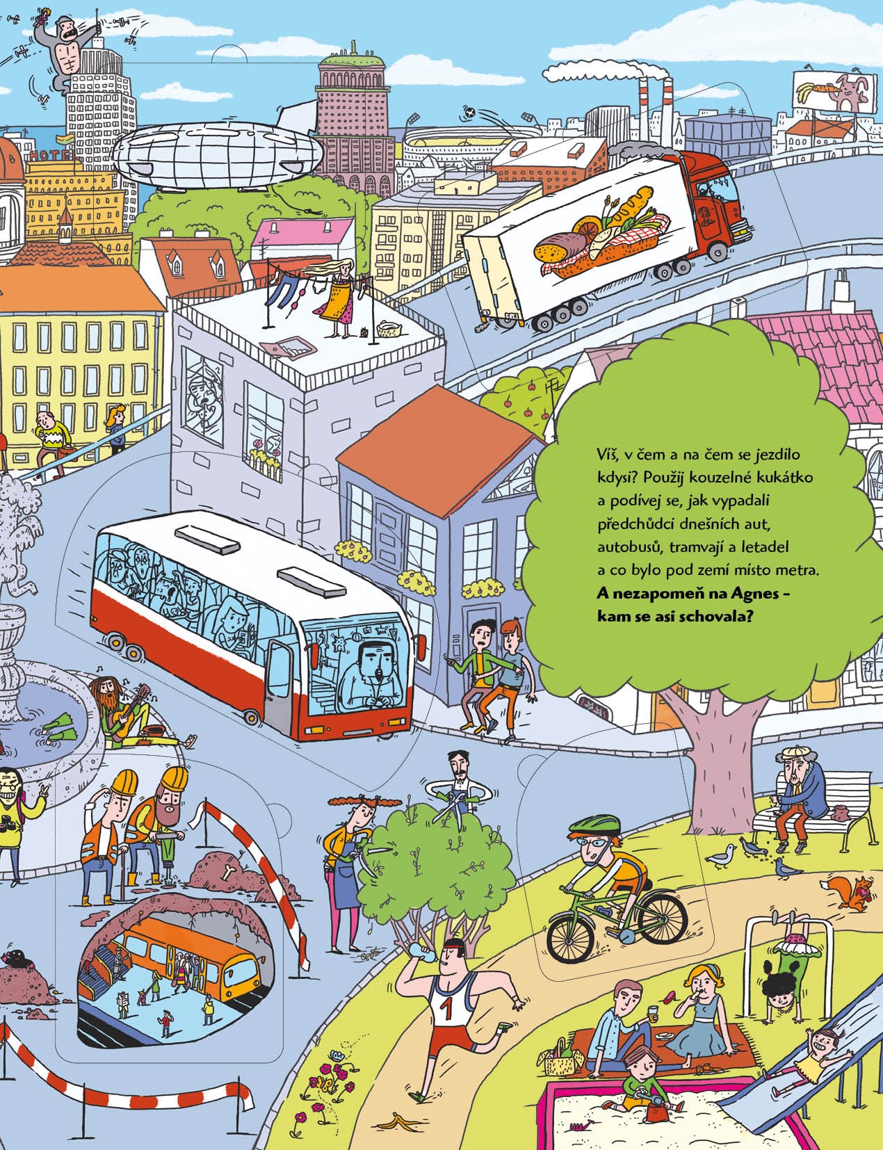 Napadlo vás někdy, jak se žilo v minulosti? Jak vypadalo první auto, předchůdce ponorky, babiččiny školní pomůcky či praprapradědečkovy kolečkové brusle? Co si oblékali lidé před sto nebo dokonce mnoha tisíci lety? Stroj času sice ještě nikdo nevynalezl, ale přesto se s námi hravě dostanete do dávných dob. Máme pro vás totiž kouzelné kukátko. Stačí se podívat pod jedno z několika desítek okének uvnitř knihy, a hned zjistíte, jak kdysi vypadal běžný den ve městě, jak se nakupovalo, čím se jezdilo, jak si hrály děti v parku, jakou podobu měly zimní radovánky, léto u moře nebo škola.