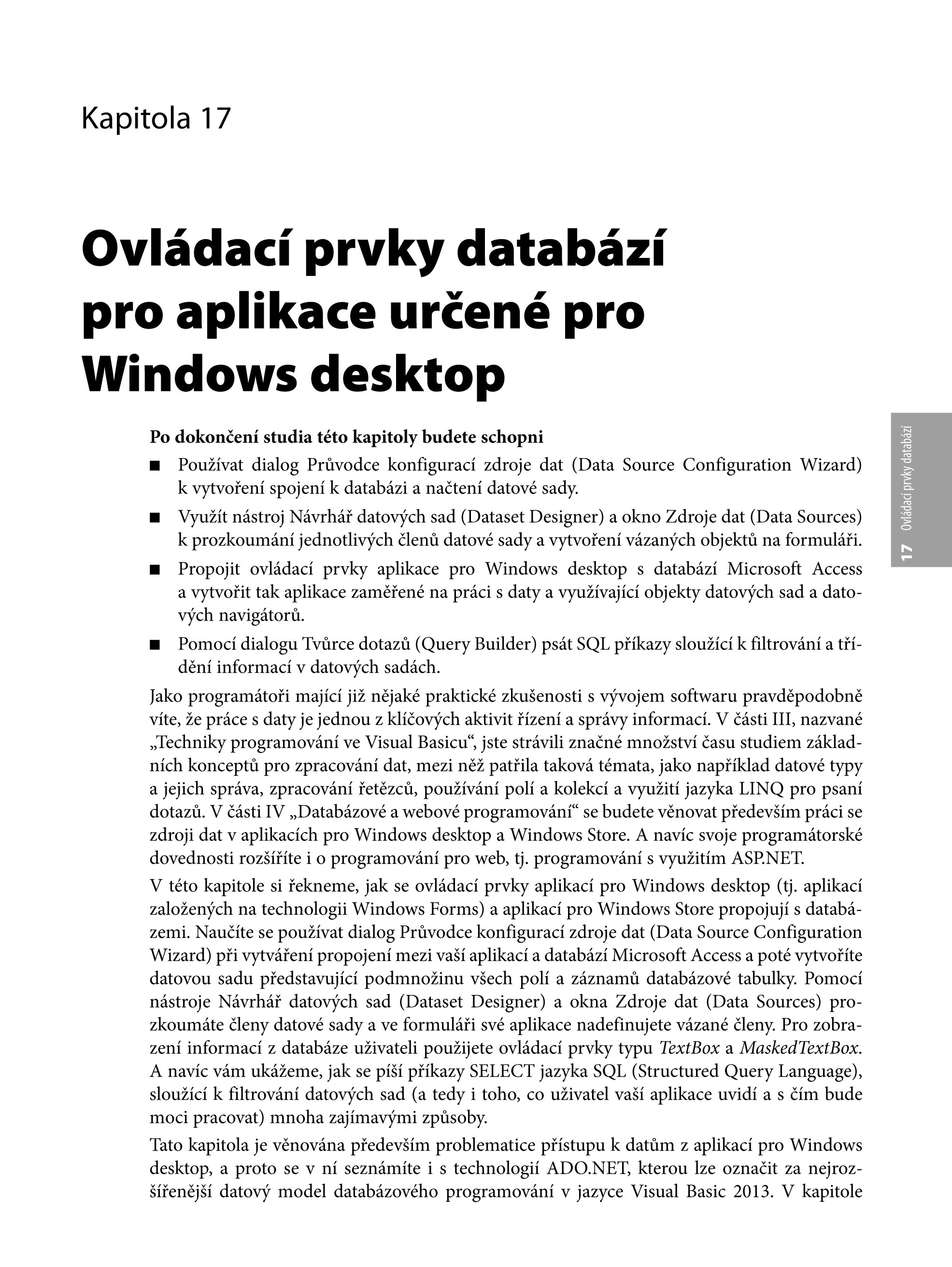 Zkušený autor stojící za desítkami publikací vás naučí, jak v krátkém čase začít programovat vlastní aplikace. Kniha navazuje na oblíbené příručky pro výuku Visual Basicu v předchozích verzích. Ke všem cvičením budete mít k dispozici startovní zdrojové kódy, které se naučíte krok za krokem upravovat až k funkčním aplikacím, takže nemusíte mít strach, že byste něčemu neporozuměli nebo na něco zapomněli.