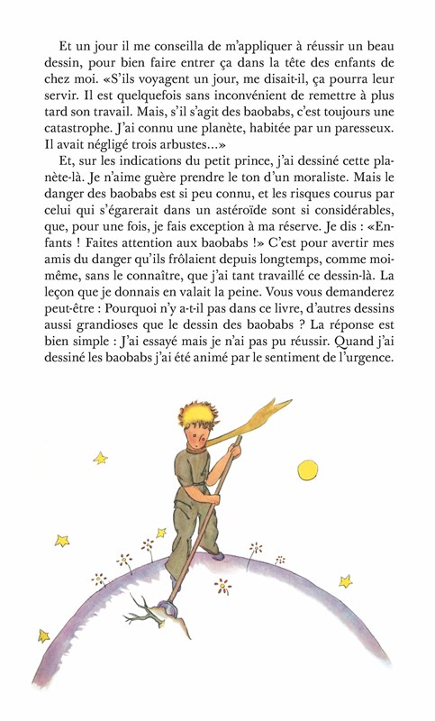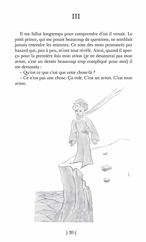 Imaginez-vous perdu dans le désert, loin de tout lieu habité, et face a un petit garçon tout blond, surgi de nulle part. Si de surcroît ce petit garçon vous demande avec insistance de dessiner un mouton, vous voila plus qu'étonné ! A partir de la, vous n'aurez plus qu'une seule interrogation : savoir d'ou vient cet étrange petit bonhomme et connaître son histoire. Tres vite, vous découvrez d'étranges planetes, peuplées d'hommes d'affaires, de buveurs, de vaniteux, d'allumeurs de réverberes.