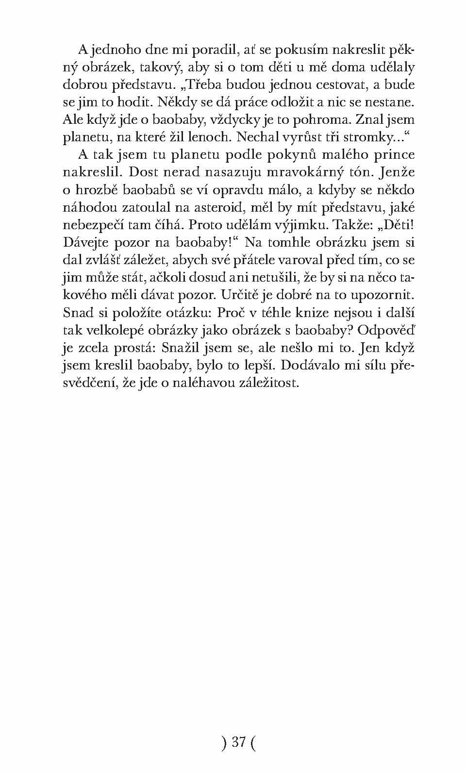 Představte si, že se ocitnete sami uprostřed pouště, kde široko daleko není živé duše, když vtom se před vámi zjeví blonďatý chlapec. A jako by to nestačilo, nedá jinak, než abyste mu nakreslili beránka. To jednoho překvapí! Od toho okamžiku už netoužíte po ničem jiném než zjistit, kde se ten zvláštní kluk vzal a co prožil. A než se nadějete, procestujete s ním planety podnikatelů, pijáků, náfuků nebo lampářů.