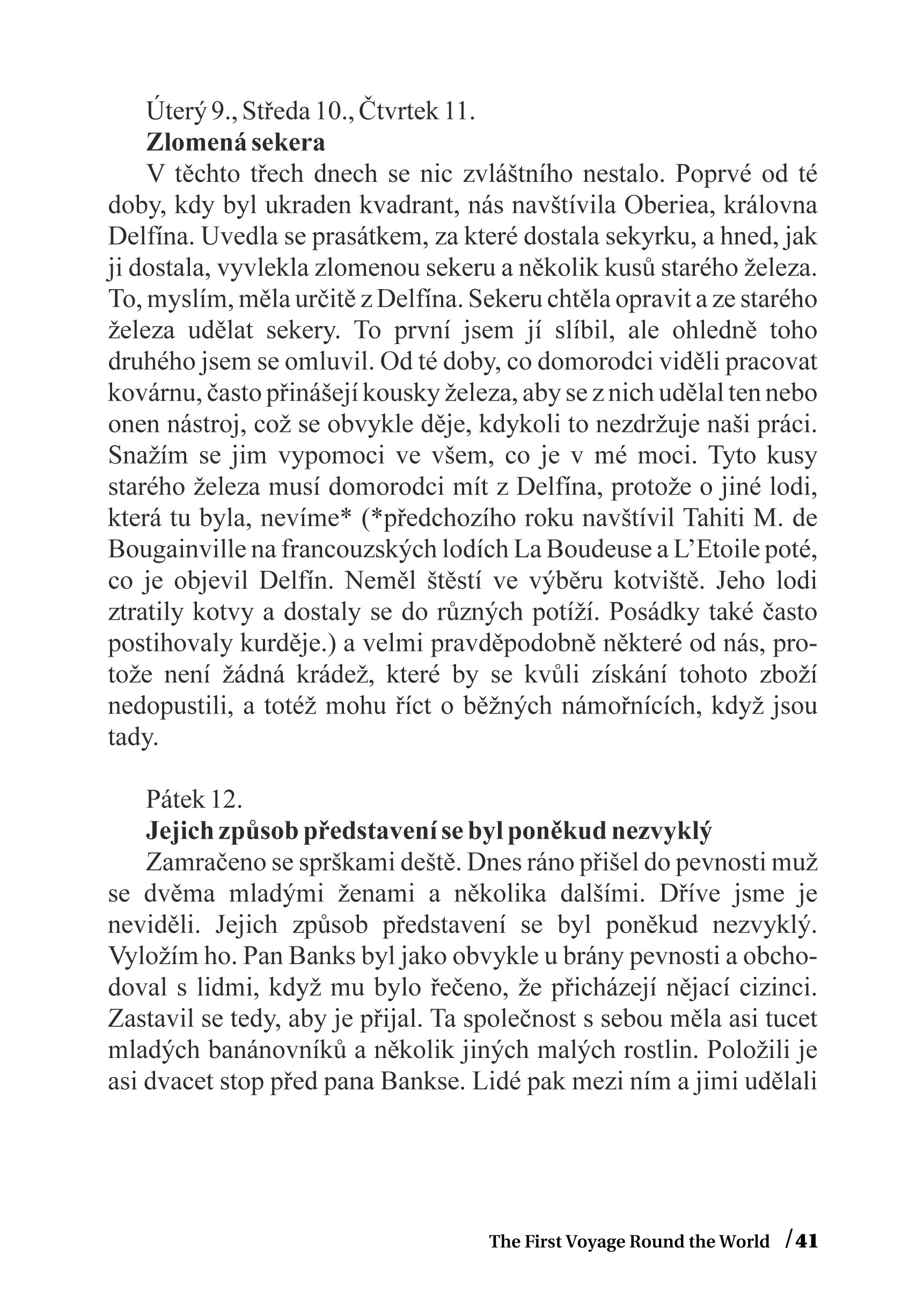 Tahiti je krásný, slunný ostrov bezstarostných lidí. Dnes přitažlivý pro exotickou dovolenou, před téměř čtvrt tisíciletím objevený kapitánem Wallisem (v roce 1767 na lodi Delfín) a od té doby znovu a znovu navštěvovaný nejen slavnými mořeplavci. Deník kapitána Cooka „klipovým“ způsobem prozrazuje, co viděl a zažil, co ho překvapilo a co dokonce přineslo konflikty. Dozvíte se o přátelskosti domorodců k námořníkům, ale i obsahu jejich kapes, o jídle, které pomocí výměnného obchodu námořníci získávali, kterým rozšířili svůj jídelníček a díky kterému dokonce začali příznivě pohlížet na dříve opovrhovaný pokrm. Poznáte sport a zábavu domorodců, obřadní ceremonie vůči živým i mrtvým, způsoby krášlení, které dnes částečně kopíruje celý svět, ruční výrobu unikátní látky a mnohé jiné. Původní vydavatel pomocí srovnání s jinými deníky na několika místech textu komentuje nebo upřesňuje Cookovy údaje.