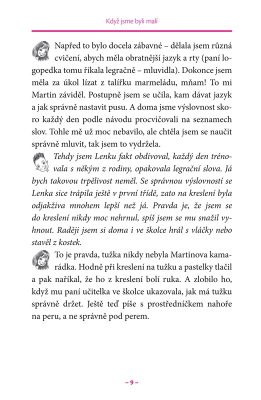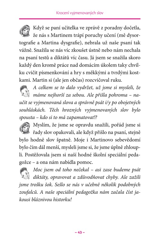 Publikace je určena dětem ve věku od 6 do 12 let, které mají potíže s dysgrafií či dysortografií, a také jejich rodičům, učitelům nebo kamarádům. Knihou provází sympatická dvojice: chlapec Martin a jeho sestřenice Lenka.