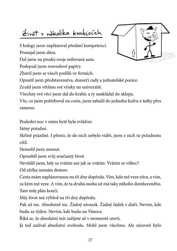 Podepsal jsem rozvodové papíry, odešel z práce a všechny své věci zabalil do několika krabic. S jedním kufrem jsem vyrazil na cestu, kde každá událost měla změnit můj směr. Kam se dostanete když stopujete s košilí a v kravatě? Proč bydlí milionáři v San Franciscu v garsonce? Proč jsou chudí lidé ti nejštědřejší? A o co tady na světě vlastně jde?