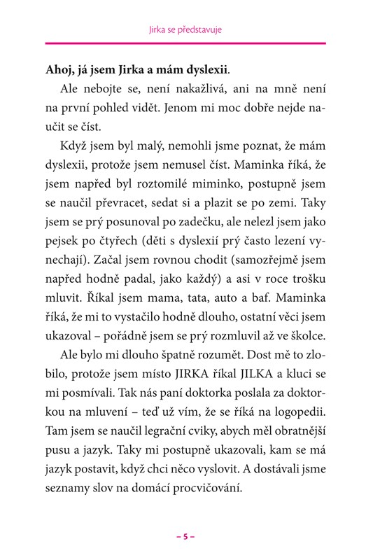 Publikace je určena dětem ve věku od 6 do 12 let, které mají potíže s dyslexií, a také jejich rodičům, učitelům nebo kamarádům. Knihou provází chlapec Jirka, který trpí poruchou čtení. Školák se vyprávěním o sobě a svém každodenním životě snaží přiblížit problémy, se kterými se děti s dyslexií běžně potýkají. Vysvětluje, jak potíže samy vnímají a co jim je pomáhá zvládnout.