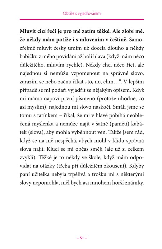 Díky vyprávění o dyslexii z pohledu dítěte a jazykem dítěte je kniha pochopitelná i malému čtenáři. V ilustrovaném příběhu se děti se stejnou poruchou snadno poznají. Naučí se nahlížet na sebe sama bez ponižujících „nálepek“ a budou umět svůj problém překonat.