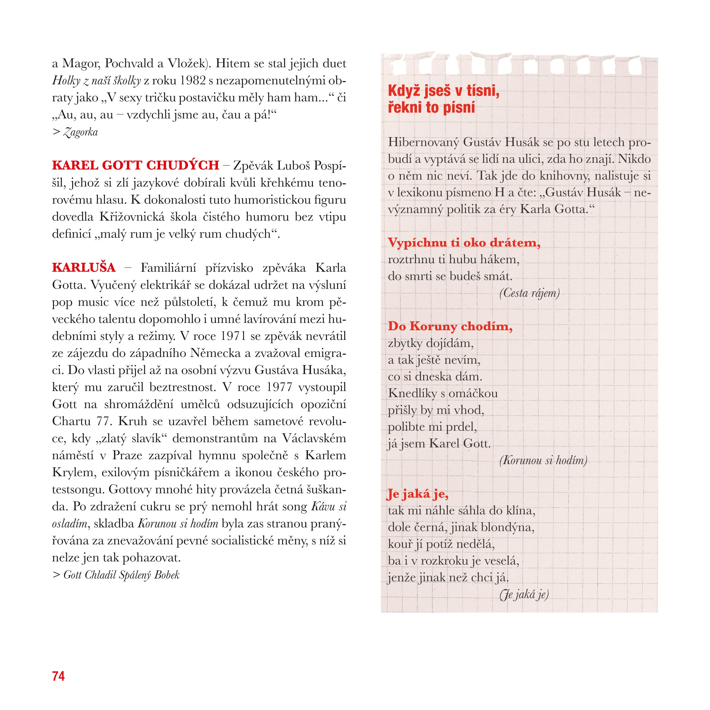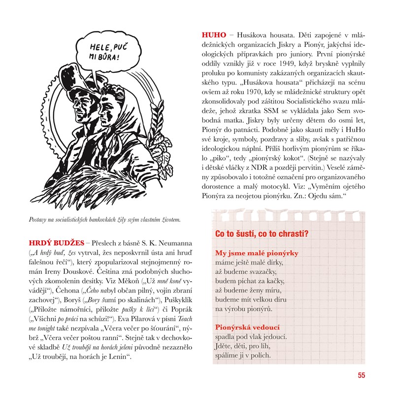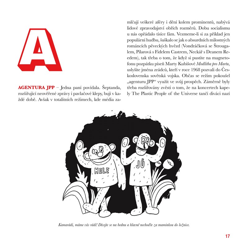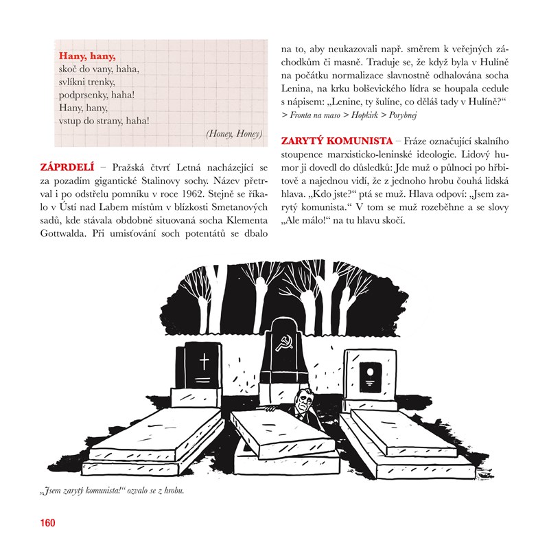 Lidová tvořivost vygenerovala v letech 1948–1989 vlastní žertovné pojmosloví důležitých fenoménů reality jako odpověď na ideologický balast oficiálního jazyka. Na pozadí dobových posměšků, ale i anekdot, hádanek, parodií či fám před čtenáři plasticky vyvstane krajina socialismu. Abecední uspořádání promíchalo časovou posloupnost v groteskní koláž, v níž se kříží témata od politiky přes pop-music až po erotiku. A jelikož mnohé z aktérů už zavál čas, doprovází každé heslo vysvětlující komentář. Čtenář tak dostává do ruky jedinečnou učebnici historie, v níž minulost ožívá skrze humor. Zábavný i poučný bedekr na cestu do hlubin totality je bohatě ilustrován.