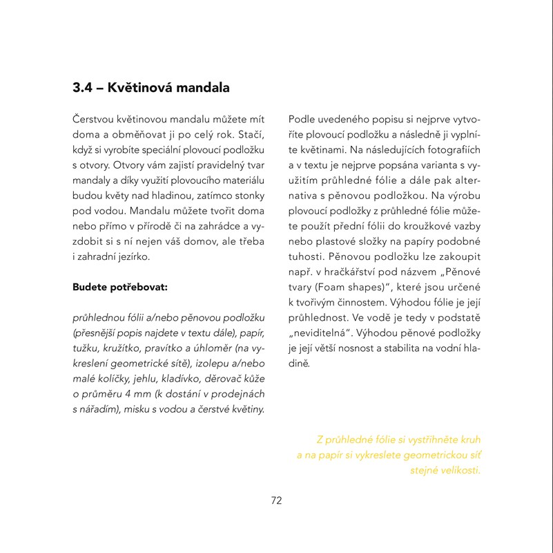 Začnete úplně od začátku – s bílým papírem a tužkou. A pomocí geometrických sítí a jejich jednoduchého využití se můžete dopracovat k mnoha krásným výtvorům, které budou harmonizovat vás i celé vaše okolí. Zkuste třeba mandaly z třpytivých sklíček, vyšívanou mandalu nebo křehkou a jemnou mandalu z čerstvých květin.