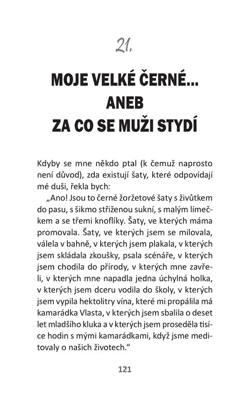Jednou mi jeden muž řekl, že jsem ho fascinovala, když jsem si ve Filmovém klubu čechrala sukni... Pamatuju si, že mi to řekl na ulici hned vedle Národního divadla a jak jsem měla šílenou touhu zavřít oči, zvrátit hlavu až ke koním, které se tam vzpínají na střeše, a zařvat silně, aby to slyšely všechny ženy na celém světě: „Tak se mi to povedlo! Ten chlap sledoval, jen jak se hýbu, a ušlo mu, že mám tlustý nohy!“