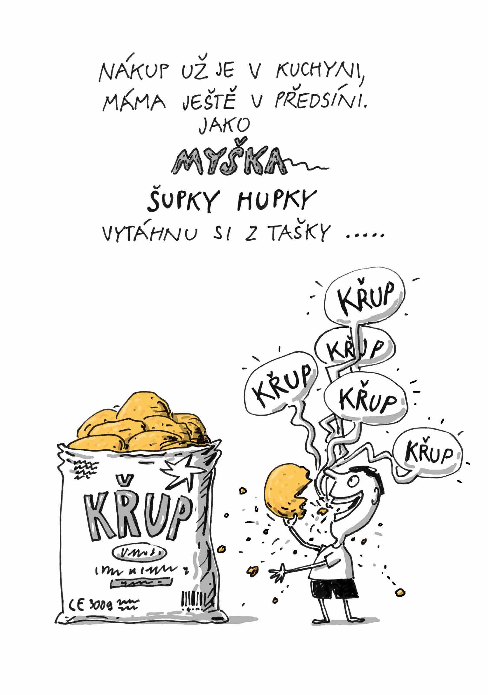 Druhá knížka vtipných a hravých říkanek, které prostřednictvím pravidelného opakování a doplňování slov, jež jsou nahrazena obrázkem, pomohou dětem osvojit si správnou podobu slov. Nedílnou součástí veršů, inspirovaných tentokrát nejrůznějšími dobrotami, jsou charakteristické ilustrace Pavla Koutského.