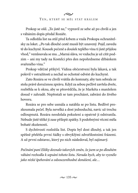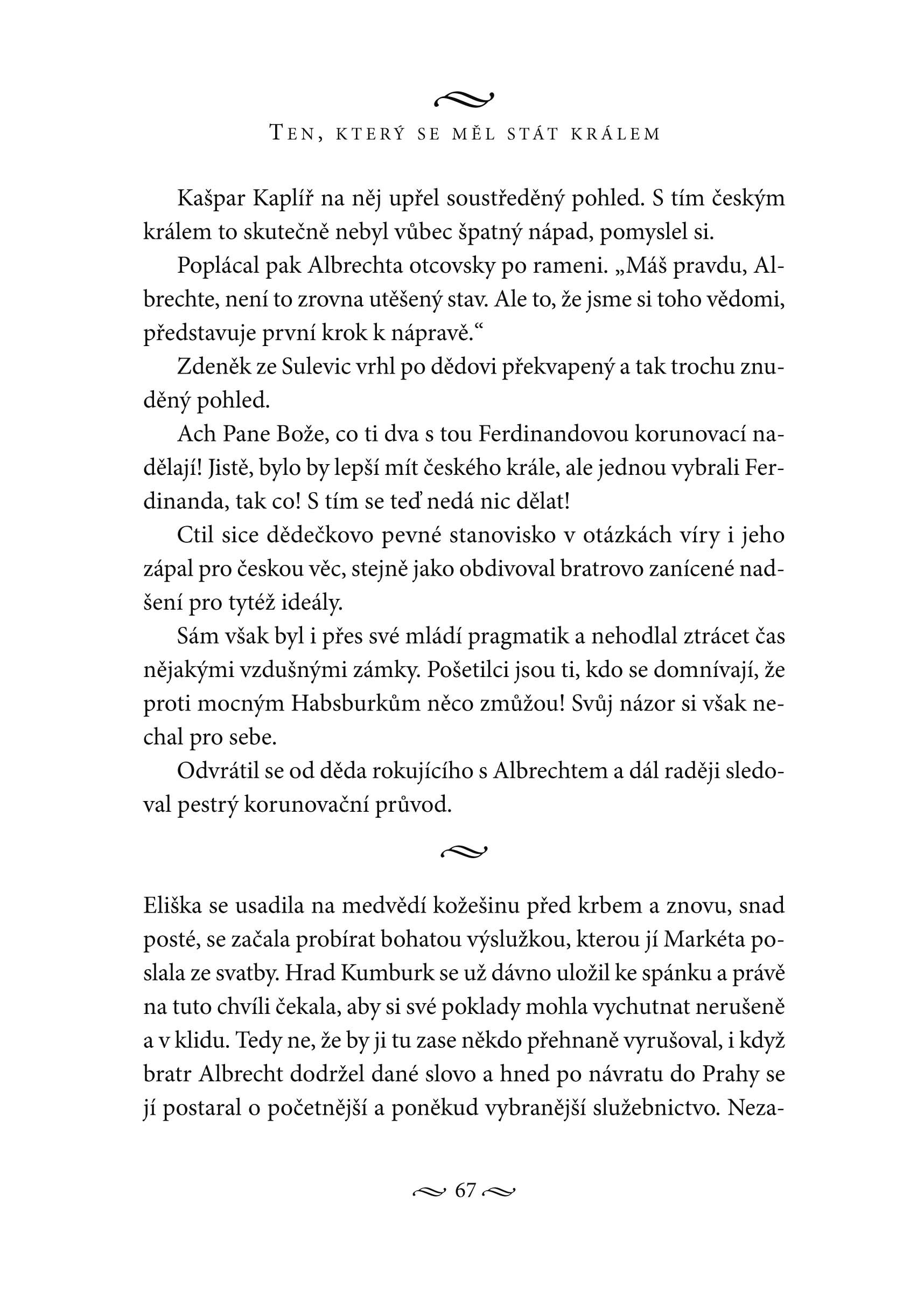 Na barvitém pozadí převratných událostí předbělohorské doby líčí autorka osudy nadějného politika a obratného diplomata Albrechta Jana Šmiřického ze Smiřic. O tomto potomkovi jednoho z nejvýznamnějších českých šlechtických rodů se skutečně uvažovalo jako o vážném kandidátovi na český trůn, a to zejména poté, co se jako jeden z hlavních iniciátorů stavovského povstání postavil do čela odbojné šlechty.