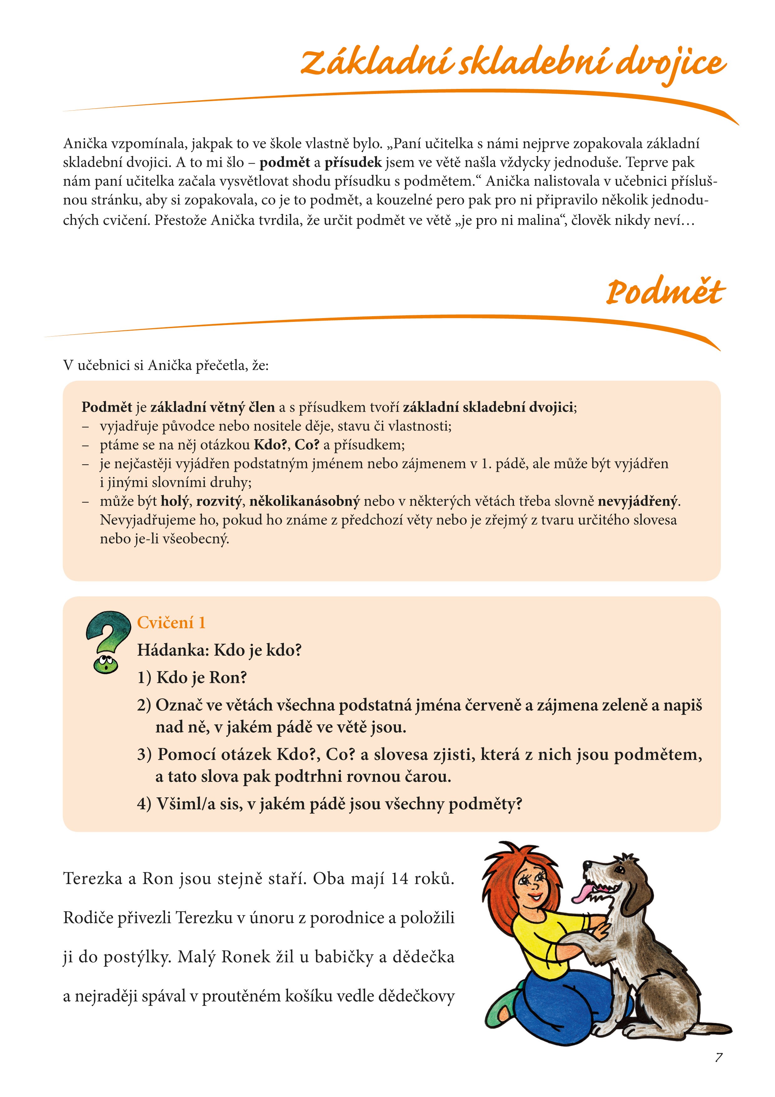 Děti knihou opět provází Anička, která si chce vylepšit známky z písemek z češtiny, a kouzelné pero, které se snaží, seč může, aby jí všechno vysvětlilo jednoduše a názorně. Společně s nimi si tentokrát procvičíte určování podmětu a přísudku ve větě a především shodu přísudku s podmětem.