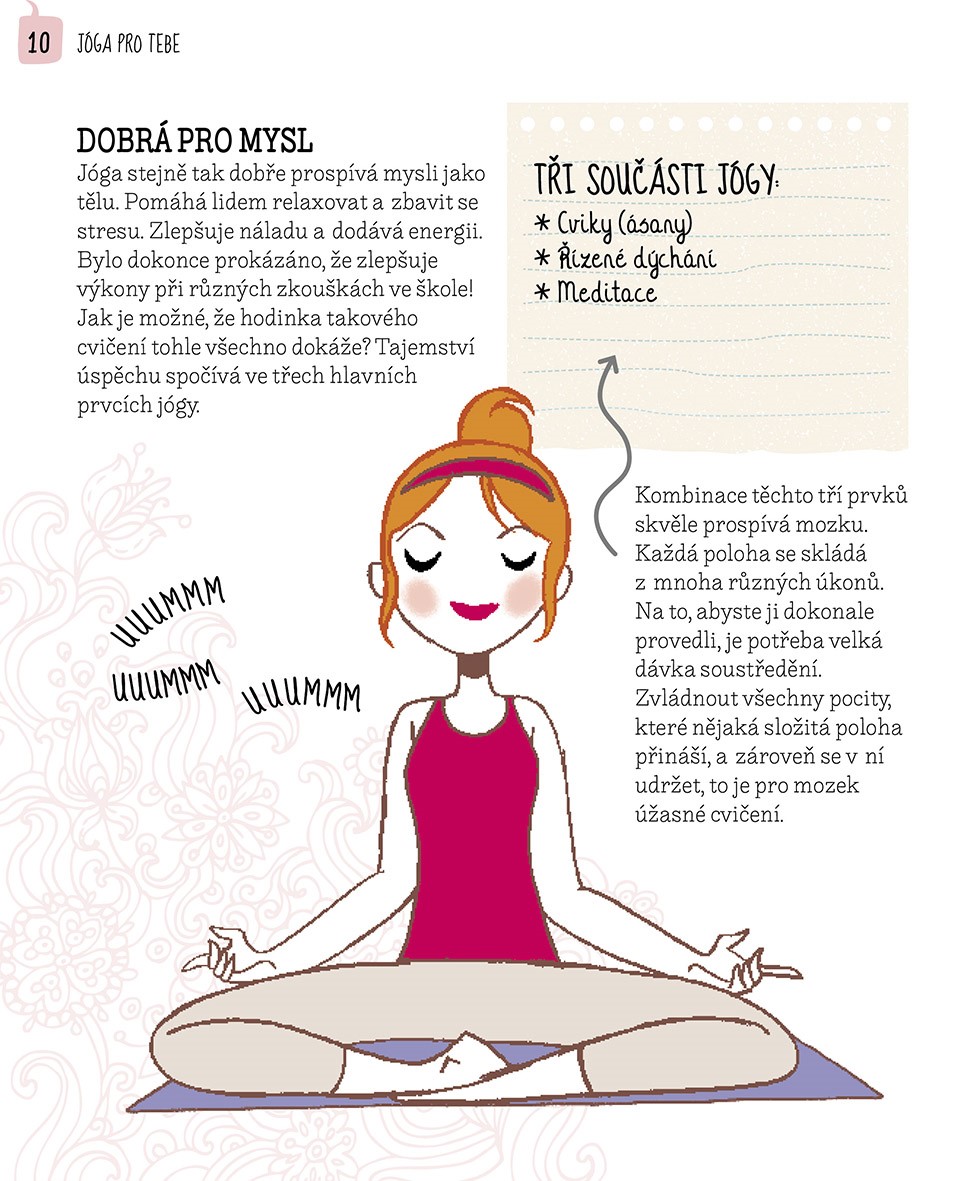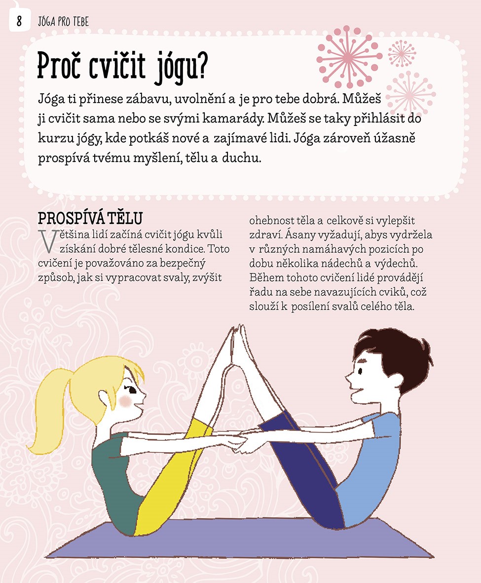 Pokud se cvičením začínáš, bude pro tebe tato kniha užitečným pomocníkem. Dozvíš se, v čem jóga spočívá a jaký je její přínos pro tvé tělo i duši. Krok za krokem se naučíš cvičit jednotlivé jógové polohy, takzvané ásany. Některé tě nabijí energií, jiné tě naopak zklidní a zbaví stresu a napětí. Nechybí rady na správné dýchání a návod na jednoduché meditační techniky.