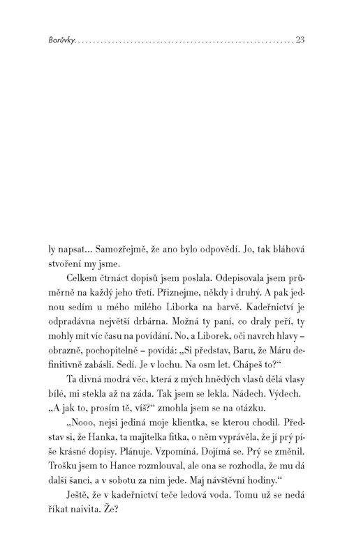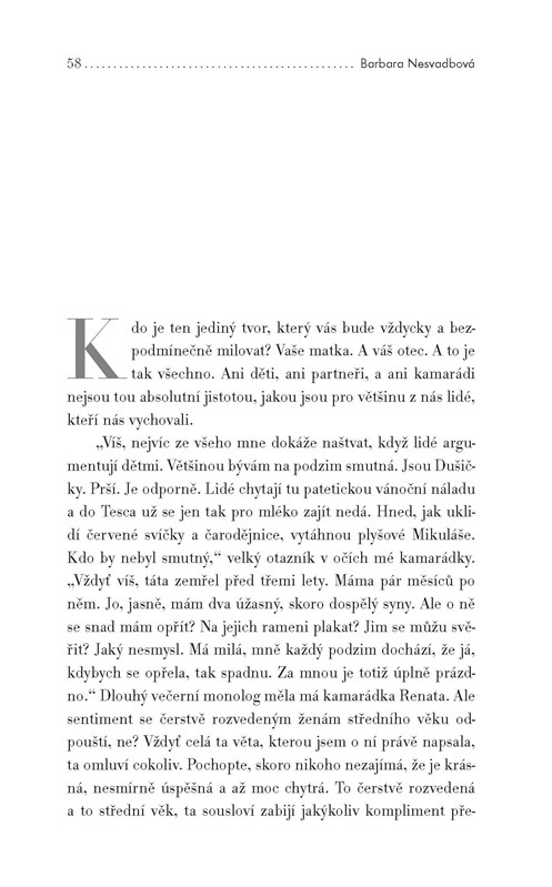 Fejetony a povídky Barbary Nesvadbové poutavě, často sarkasticky, někdy s nadhledem, ale vždy s krystalickou upřímností vypráví o ženském světě. Ať už z pozice manželky, milenky, či matky. Reflektují pozici současných vztahů. Nelehkost navázat blízkost. Tíhu odpovědnosti i touhu po nových začátcích.