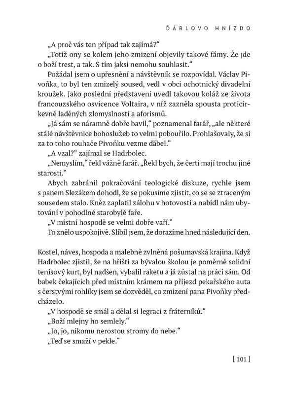 Kniha Ďáblovo hnízdo a jiné detektivní povídky zahrnuje celkem devatenáct příběhů a čtenáři se v ní opět setkávají s dvojicí detektivů, z nichž jeden oplývá nevšedními schopnostmi. Jiří Hadrbolec vypadá, jako by dělal všechno možné, jen ne svou práci. Vášnivě rád vyhrává tenisové turnaje, ve vlnách tvůrčího chvění píše básně nebo hraje na kytaru… a jen tak mimoděk chytí únosce, odhalí vyděrače nebo usvědčí vraha. Někdy mu v tom pomohou jeho nebývalé řidičské dovednosti, jindy mimořádně vyvinutý čich. Nikdy nevíte, kudy se bude ubírat jeho intuice…