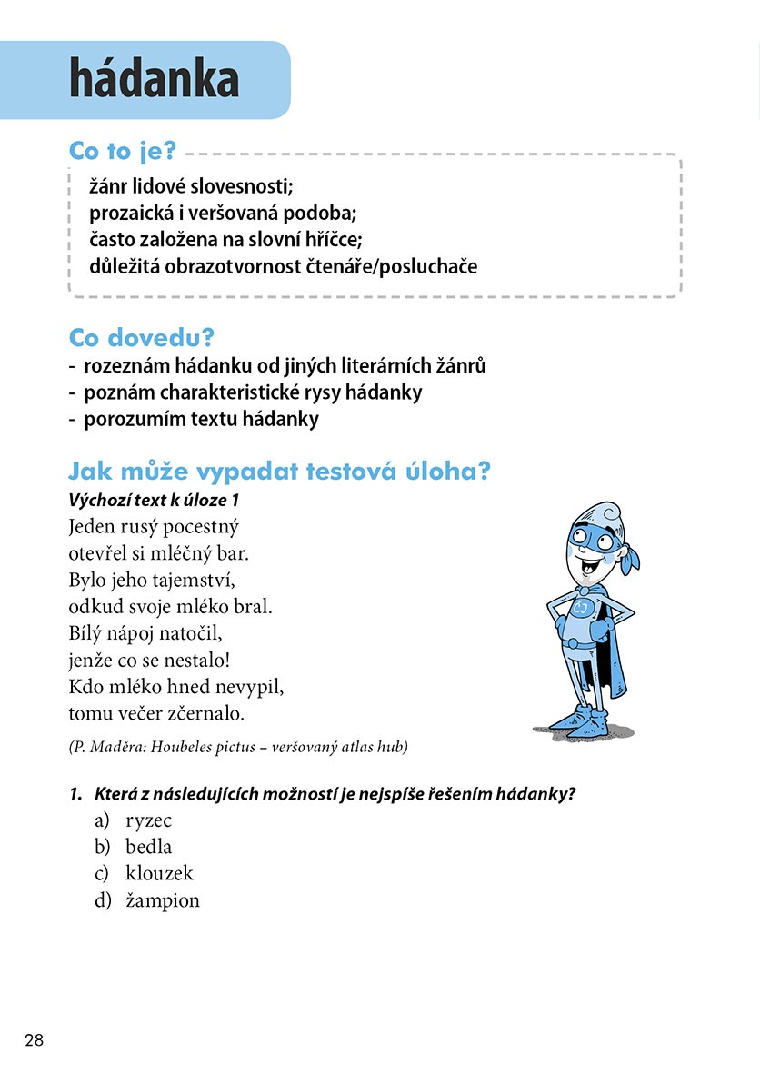 Pokud se připravují na státní přijímací zkoušky na osmileté gymnázium, jistě oceníte příklady toho, jak může být znalost daného hesla ověřována v didaktickém testu z českého jazyka a literatury, který připravuje CERMAT.
