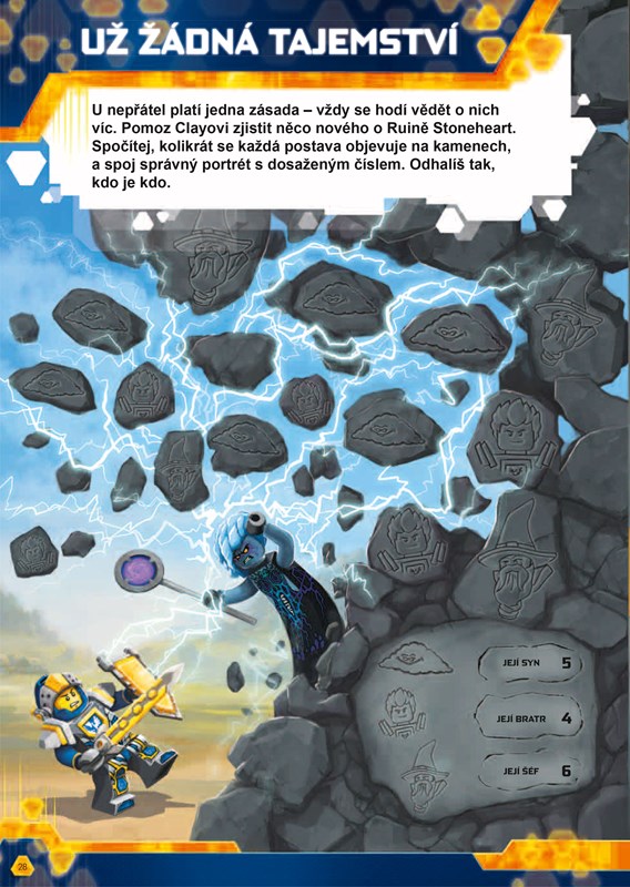 Je čas přidat se k týmu NEXO KNIGHTS™ na jejich misi za záchranou Claye z Monstroxových ďábelských spárů! Vyřeš hádanky a přečti si o dobrodružstvích, která rytíři zažívají, když se snaží překazit Monstroxovo snažení. Chce totiž přetáhnout jejich vůdce na stranu zla a získat Zakázané síly. Nakonec pomoz hrdinům v jejich boji proti Generálu Krakenskullovi a jeho mocné kamenné armádě.