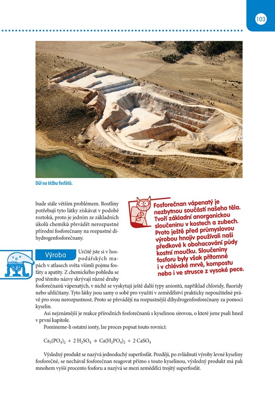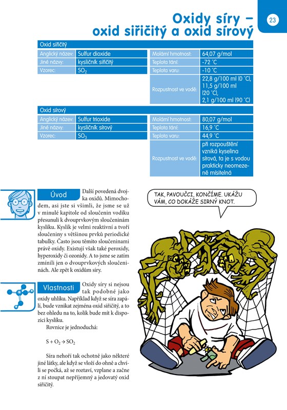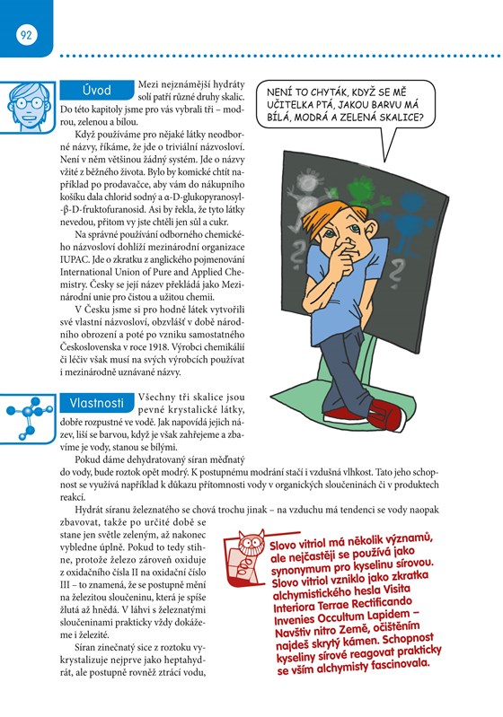 Na okolní svět jsme se tentokrát podívali skrze několik desítek anorganických sloučenin, s nimiž se běžně setkáváme v domácnosti, v obchodech, v dopravních prostředcích, ale i tajuplné školní laboratoři. První místo mezi nimi patří zaslouženě kyselině sírové, která udivovala již naše předky, nemineme však ani oxid uhličitý, peroxid vodíku, hydroxid vápenatý, síran měďnatý a mnohé další a svými názvy ještě podivnější sloučeniny z našeho sousedství. V knize zkrátka nechybějí důležité oxidy, halogenidy, kyseliny, hydroxidy a soli.